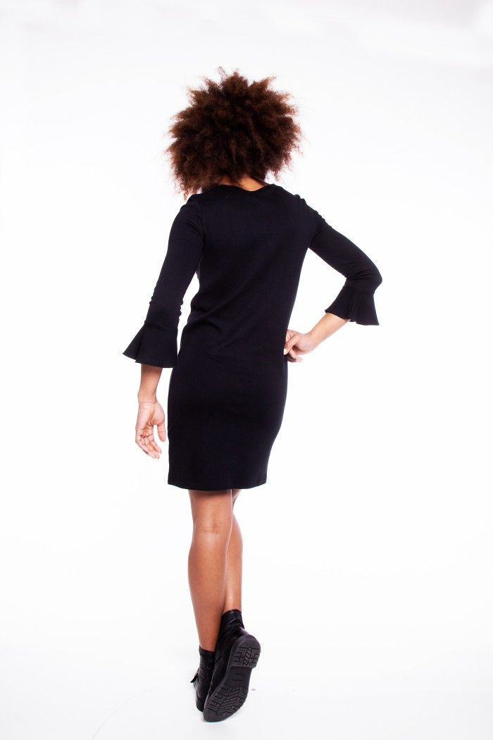 Vestido negro con manga tres cuartos avolantada. Escote redondo con lagrima y decoración por bordado floral.