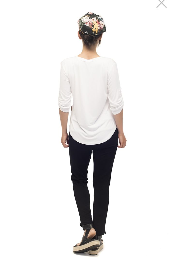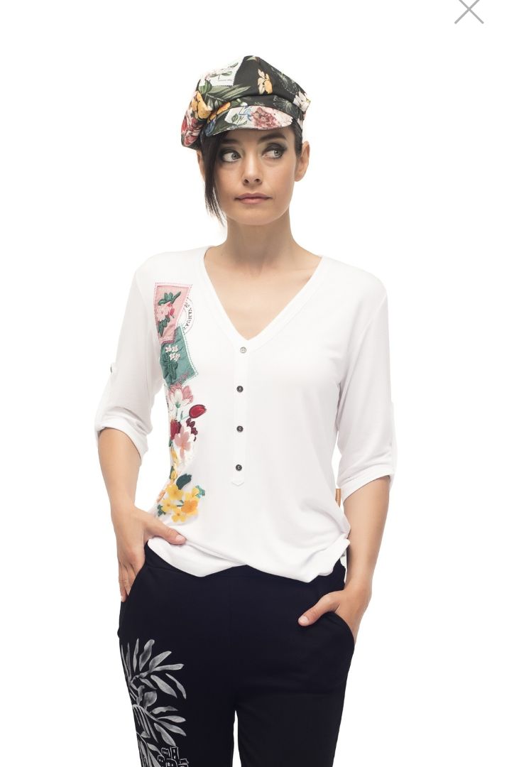 Camisa blanca con escote en pico realizado en viscosa blanco roto. Manga francesa con tirador para poder recogerla. Bordado en el delantero.