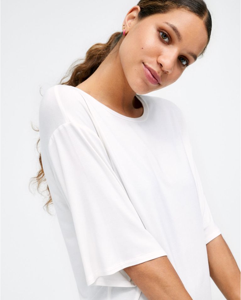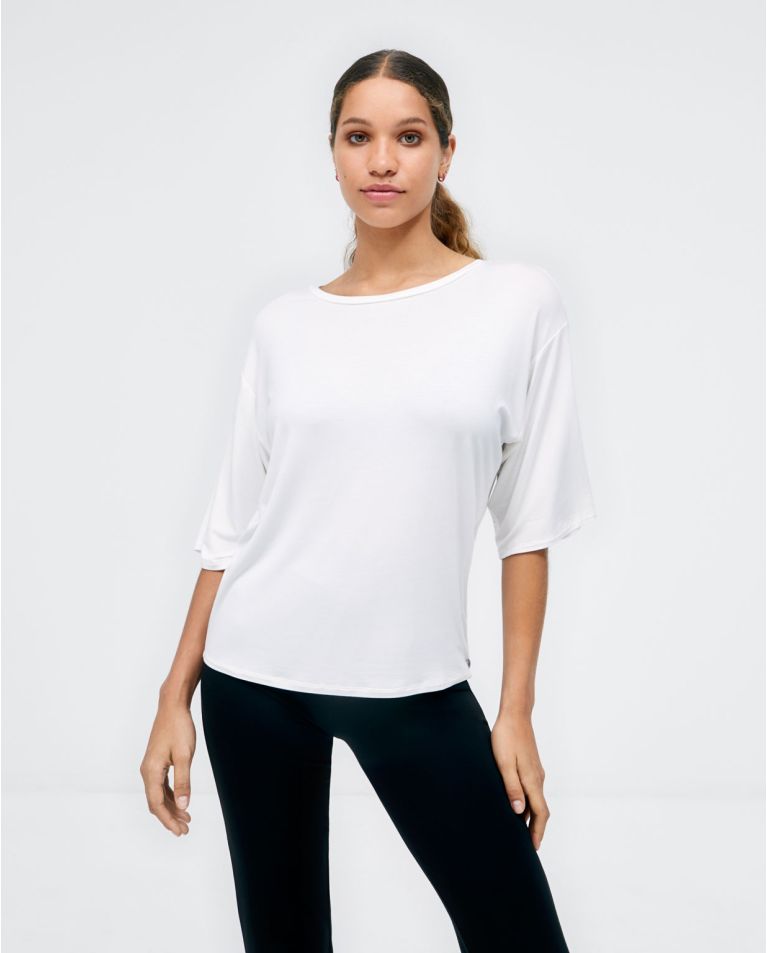 Camiseta de talle ancho y manga 3 4. Cuello barco. Confeccionada con un tejido elástico muy cómodo.