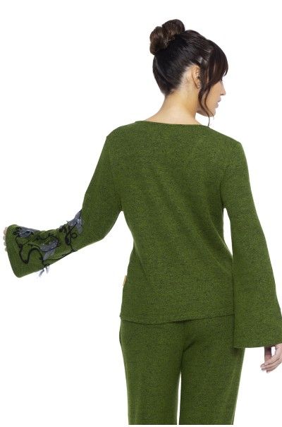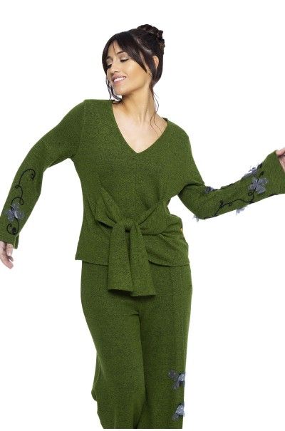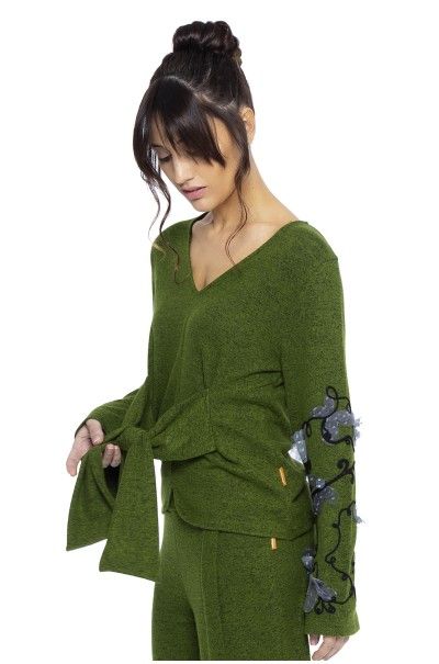 Sweater con escote en pico realizado en nuestro suave punto de hilo torcido en color verde. Lazada en forma de lazo en el delantero. Bordado en las mangas de cordón y tul.