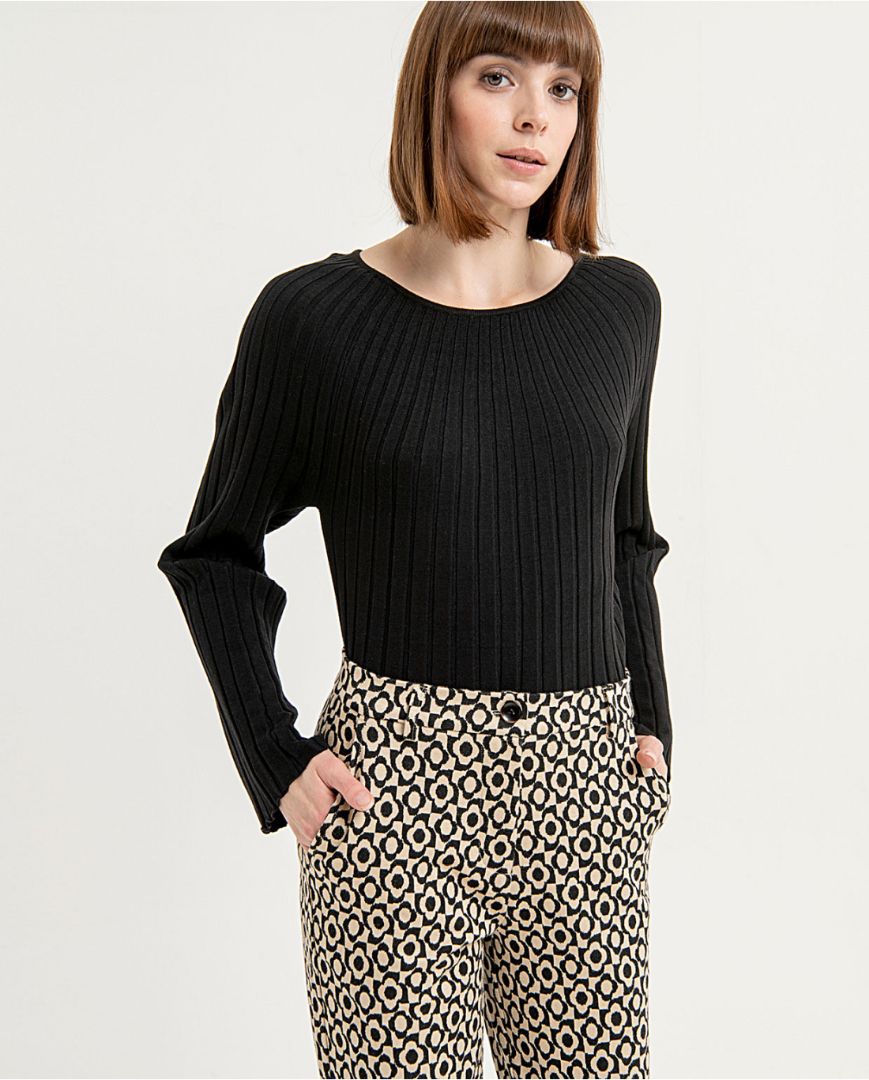 Pantalón largo ligeramente acampanado, cierre con botón y cremallera frontal. Con dos bolsillos ojal delante en oblicuo y dos bolsillos ojal rectos detrás. Confeccionado con tejido elástico muy cómodo. Estampado flores.