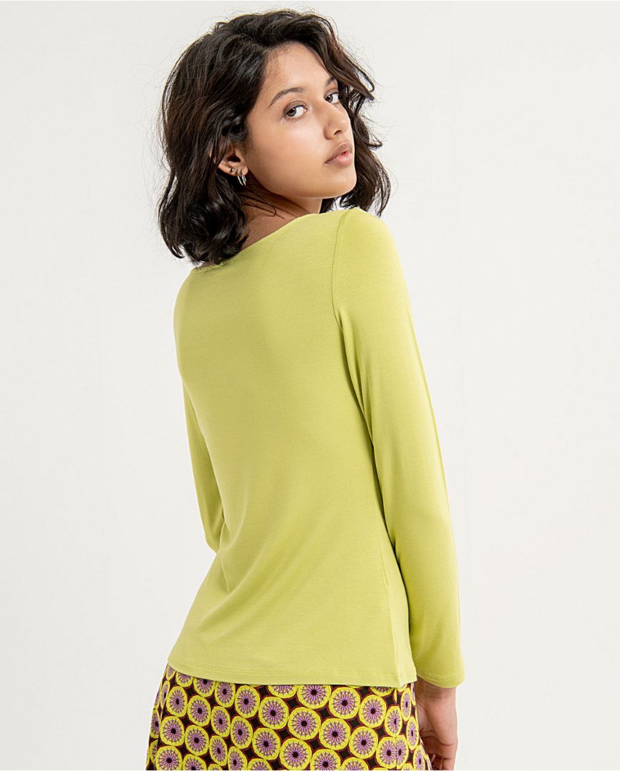Camiseta de manga larga entallada y cuello barco. Confeccionada con tejido elástico muy cómodo y un alto porcentaje de tejido ecológico. Lisa.