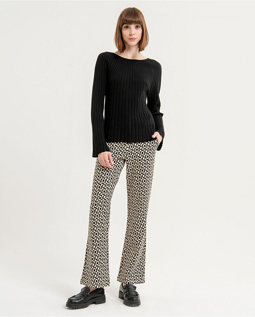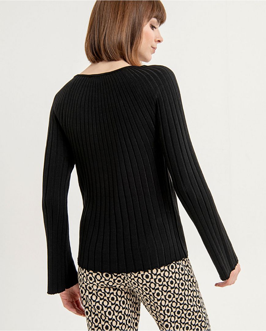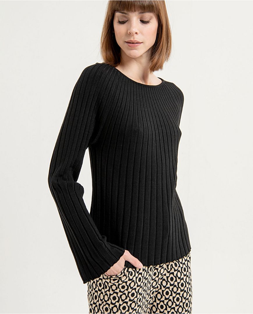 Jersey canalé de manga larga tipo raglán acampanada y cuello redondo. Canalé. Confeccionada con tejido elástico muy cómodo y un alto porcentaje de tejido ecológico. Liso.
