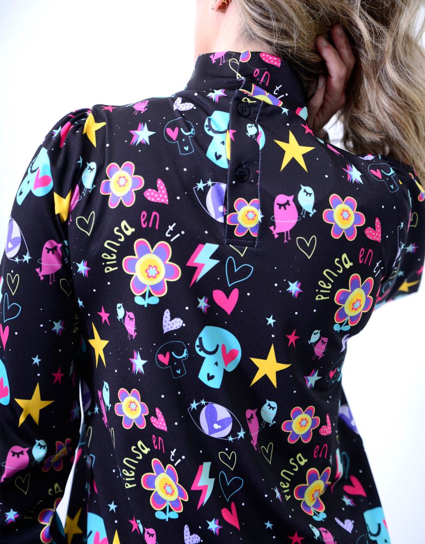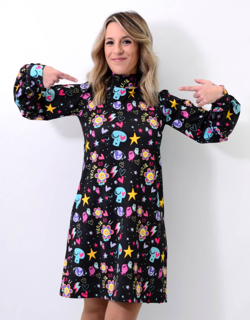 Vestido corto con estampado lleno de color y vida! Corte evasé, cuello alto, cerrado en espalda con botones y manga abullonada con botón.