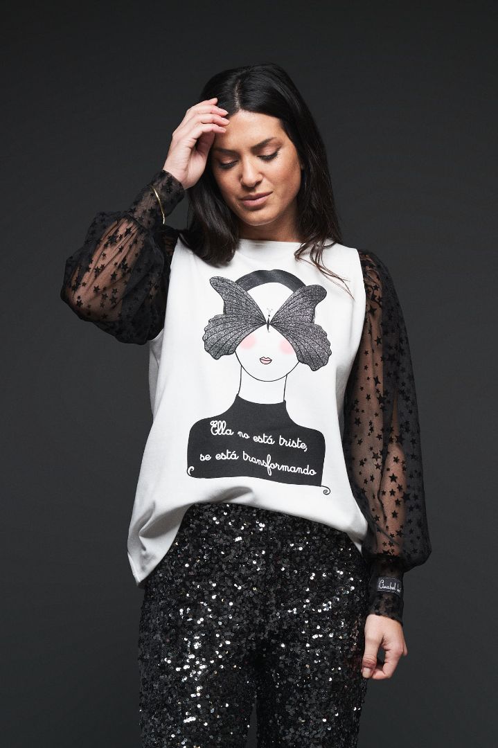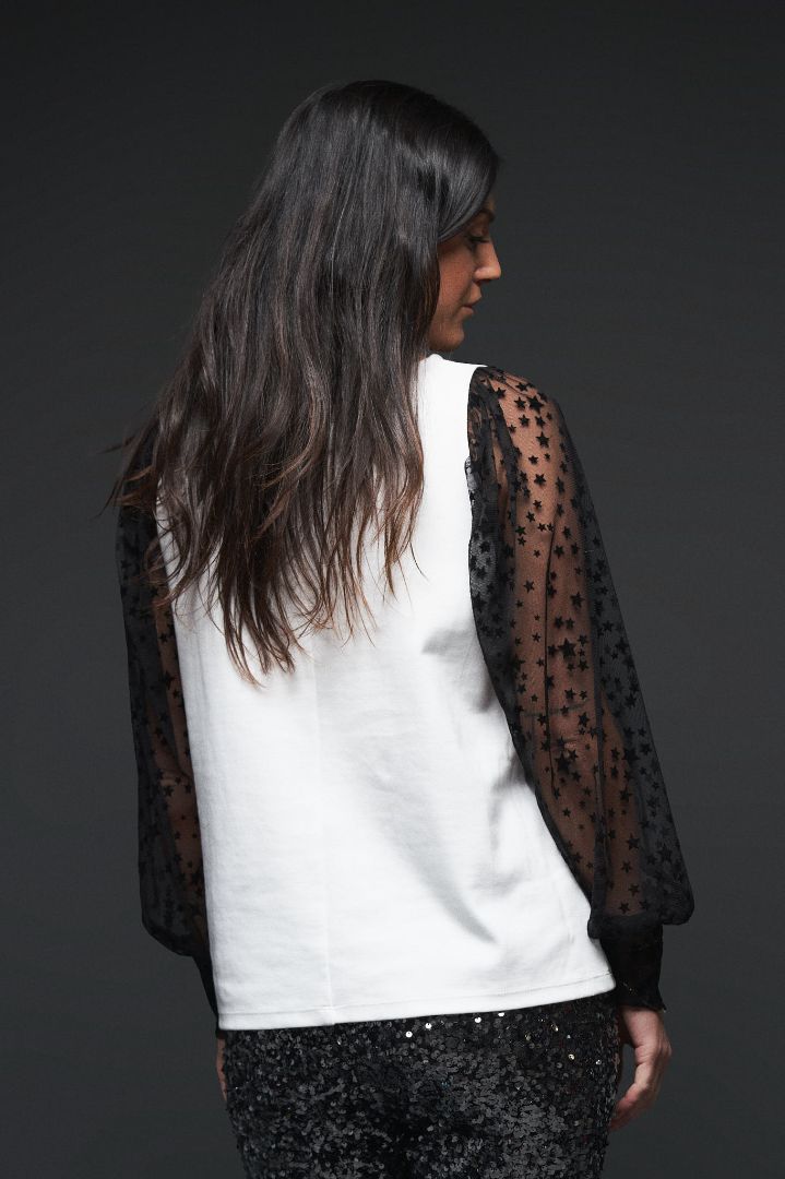 – Manga de tul transparente con estampado allover de estrellas, detalle de relieve y flok sobre estrellas.