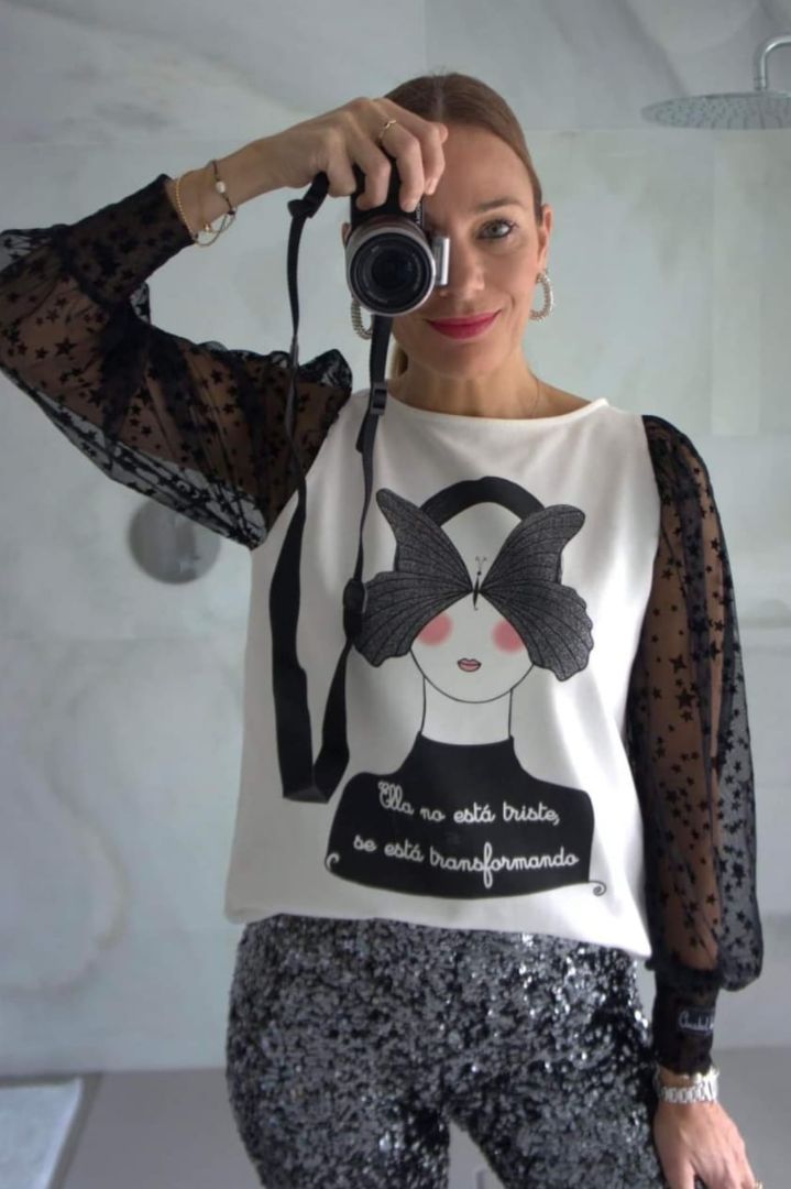 – Top de manga larga ligeramente abullonada y cuello redondo.