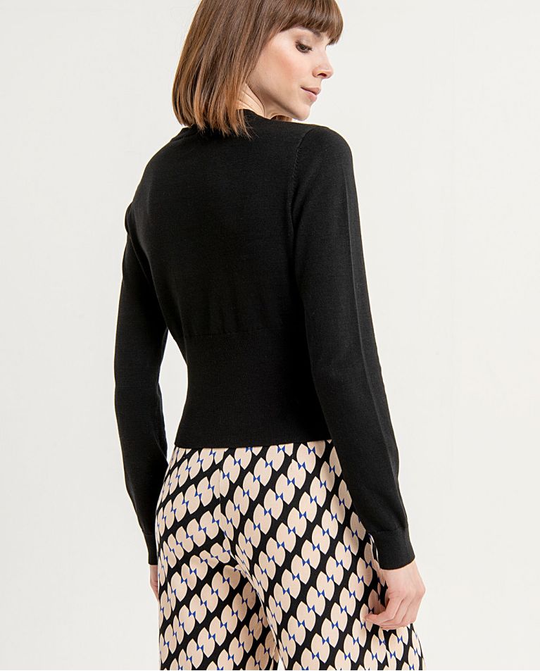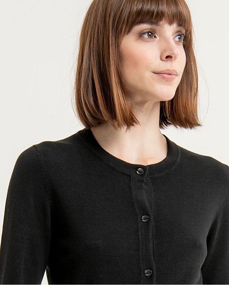 Chaqueta cárdigan de punto de manga larga con puños de cuello redondo tipo caja y cierre con botones. Talle corto y cintura entallada. Confeccionada con tejido elástico muy cómodo y un alto porcentaje de tejido ecológico. Lisa.