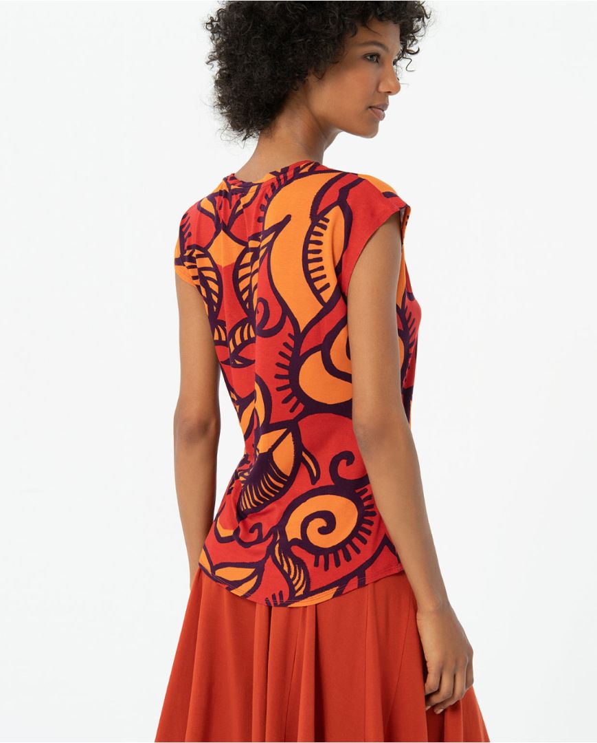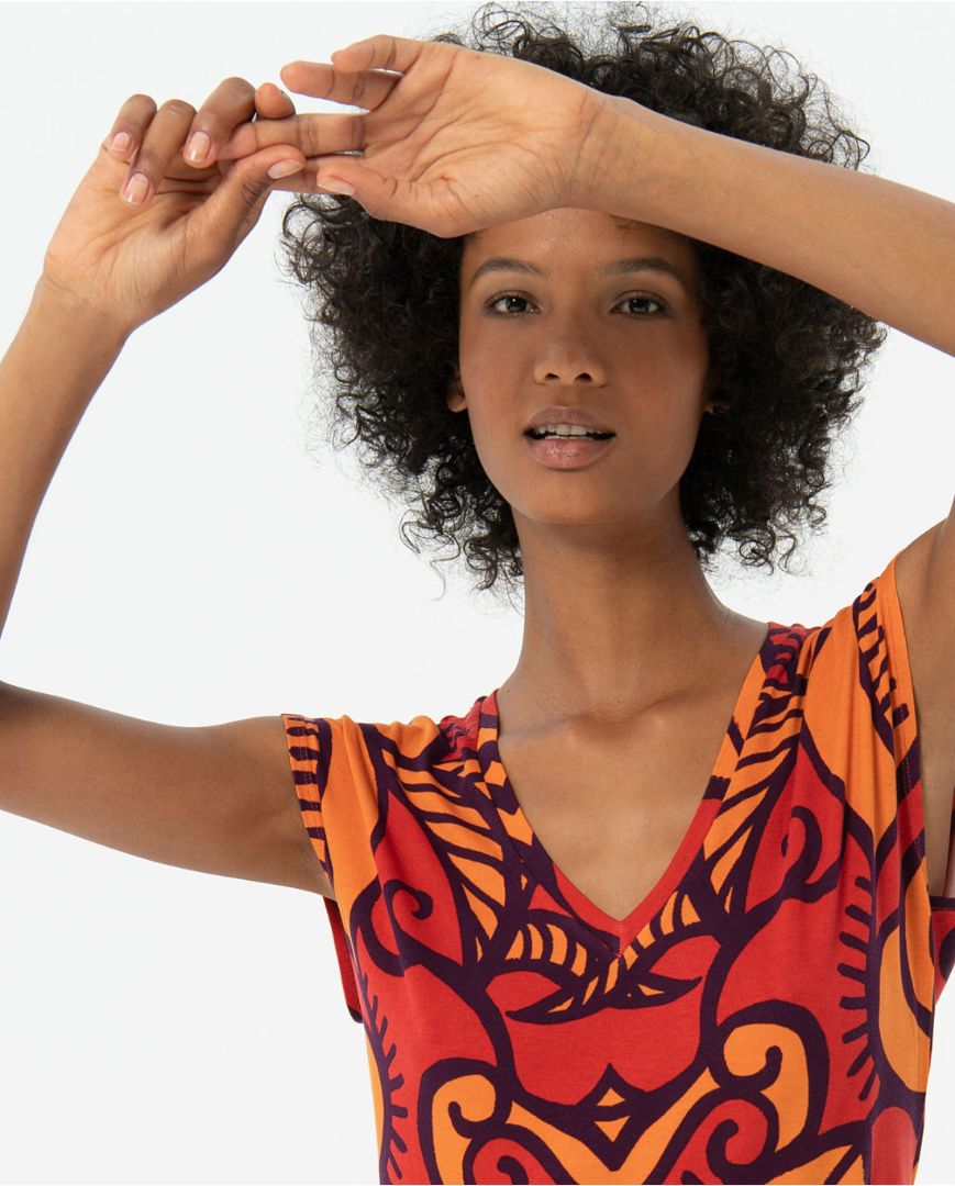 Camiseta escote pico estampada con manga corta caída al hombro. Confeccionada en un tejido muy suave y elástico.