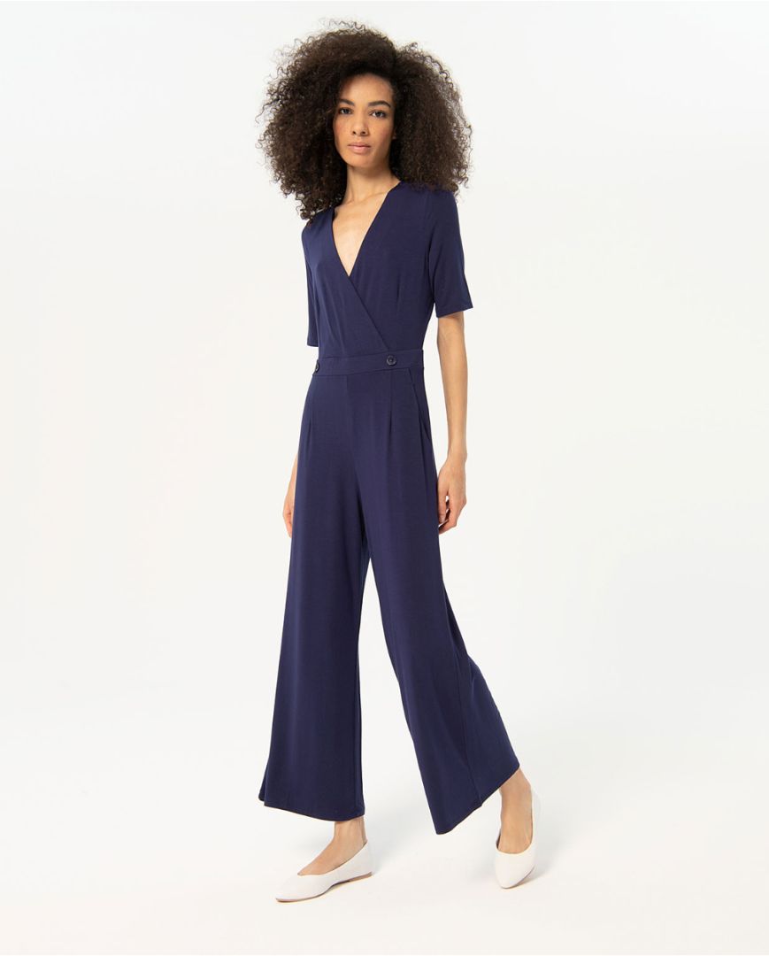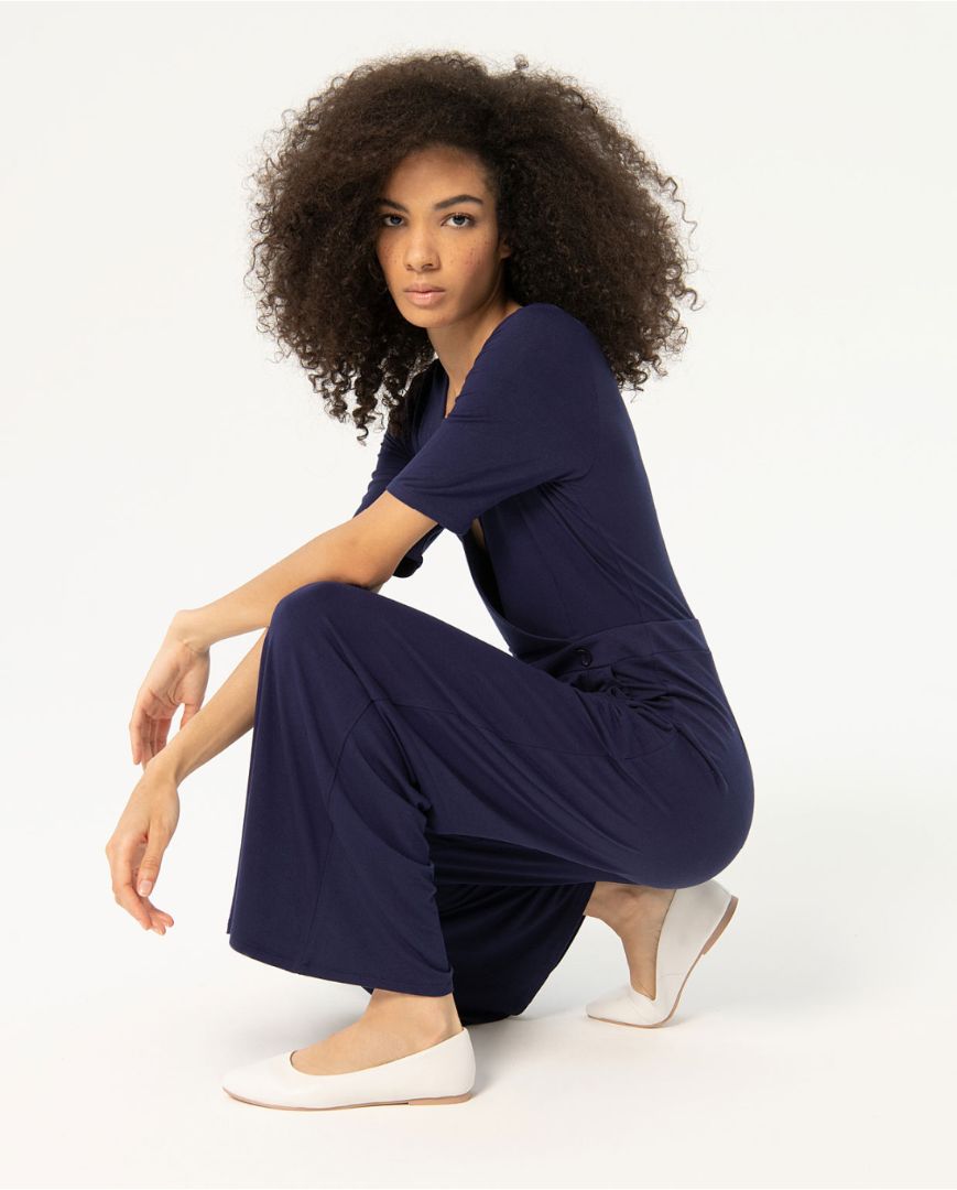 Mono de manga corta, escote cruzado y detalle de botones en la cintura. Tejido elástico muy suave.