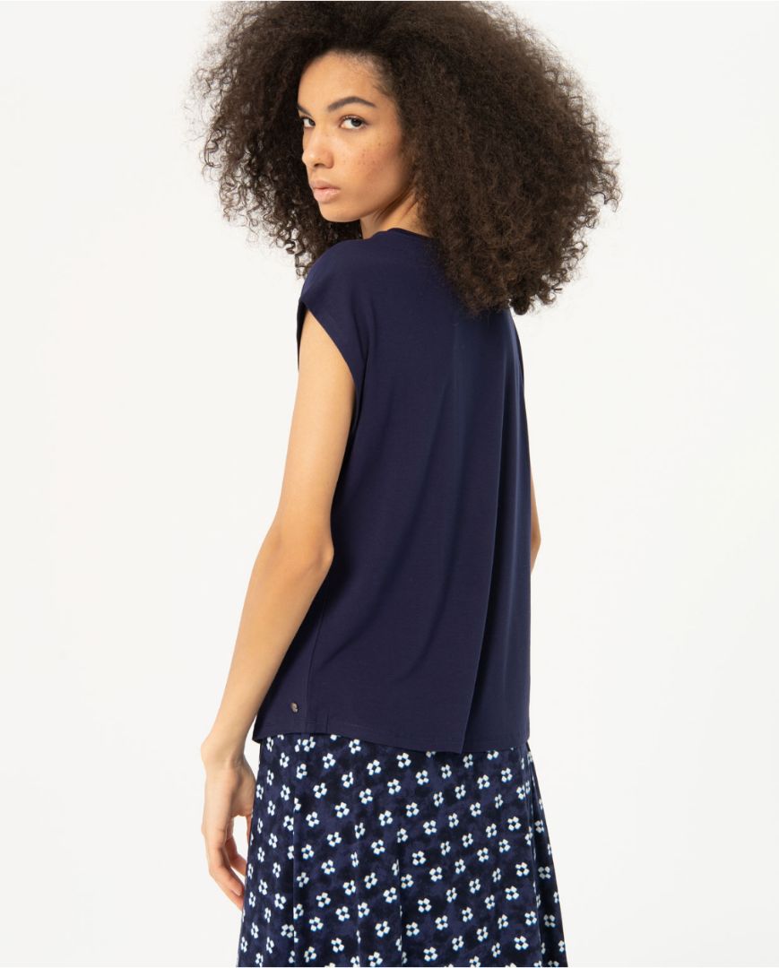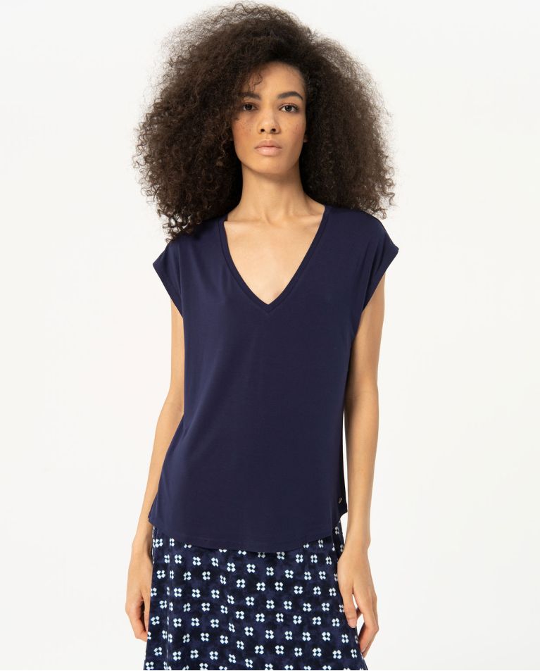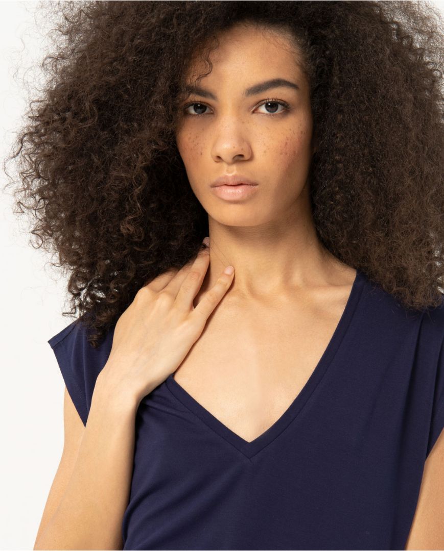 Camiseta con escote pico, sin mangas, con efecto de hombro caído. Confeccionada en un tejido muy suave y elástico.