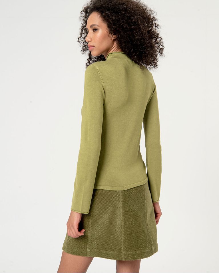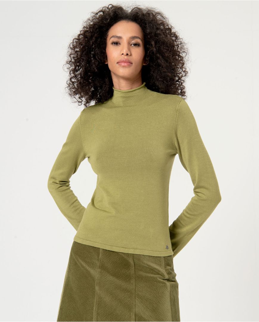 Jersey básico de punto fino y cuello perkins. Confeccionado en viscosa de bambú, muy suave y elástico.