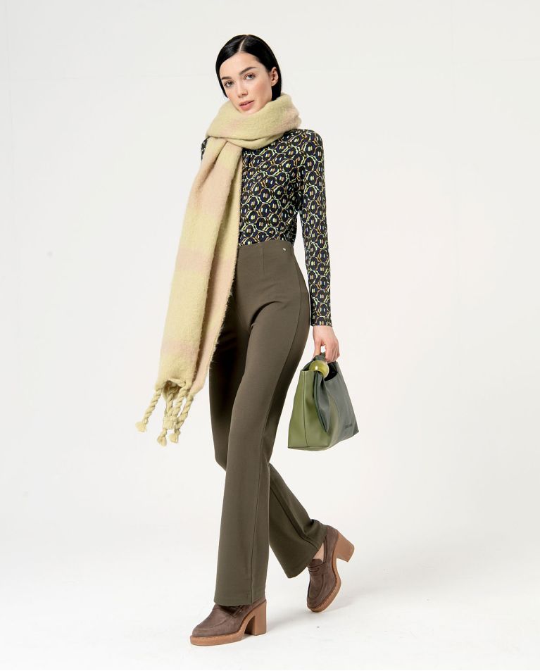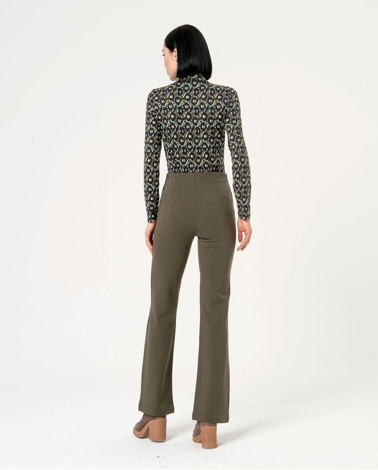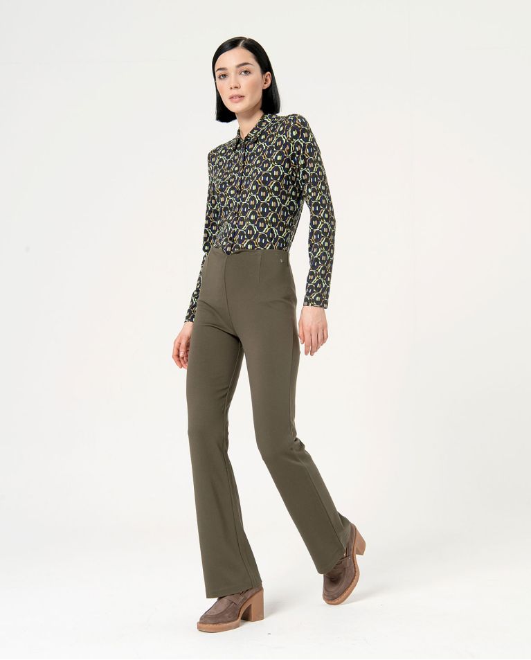 Pantalón flare de punto roma elástico y sin cierres. Color liso.