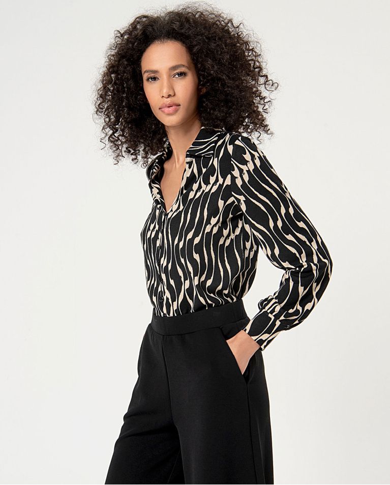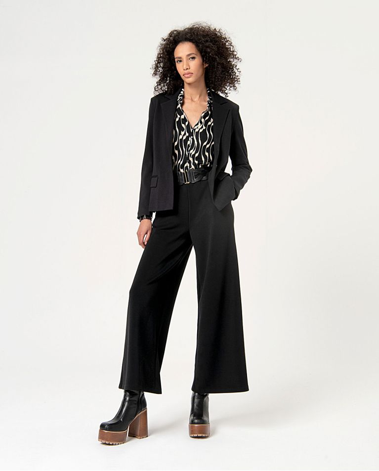 Pantalón de corte palazzo con bolsillos delanteros sin cierres. Color liso.