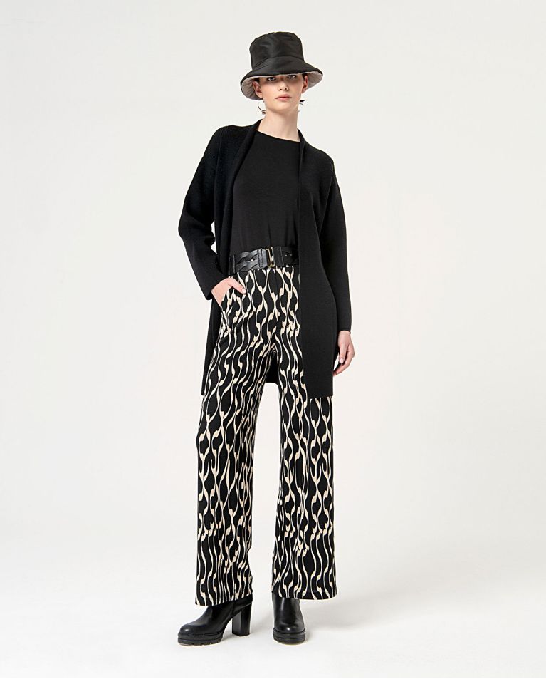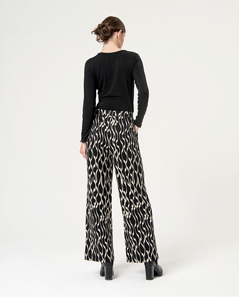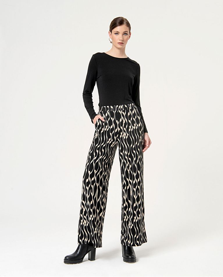 Pantalón recto de pernera ancha. Bolsillo delanteros. Cintura y tejido elástico, sin cierres.