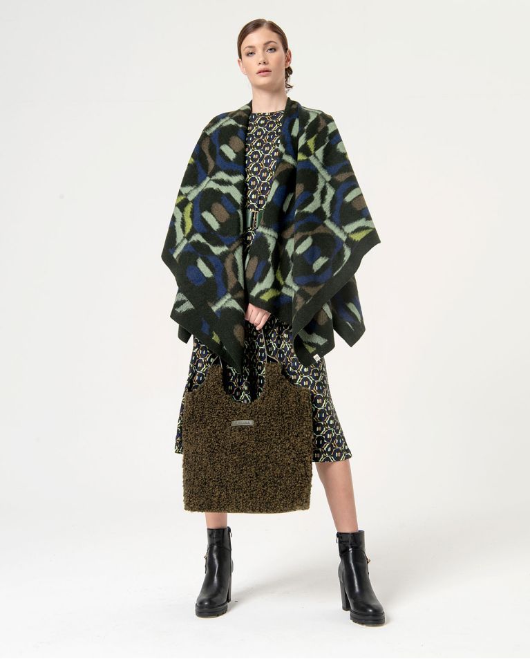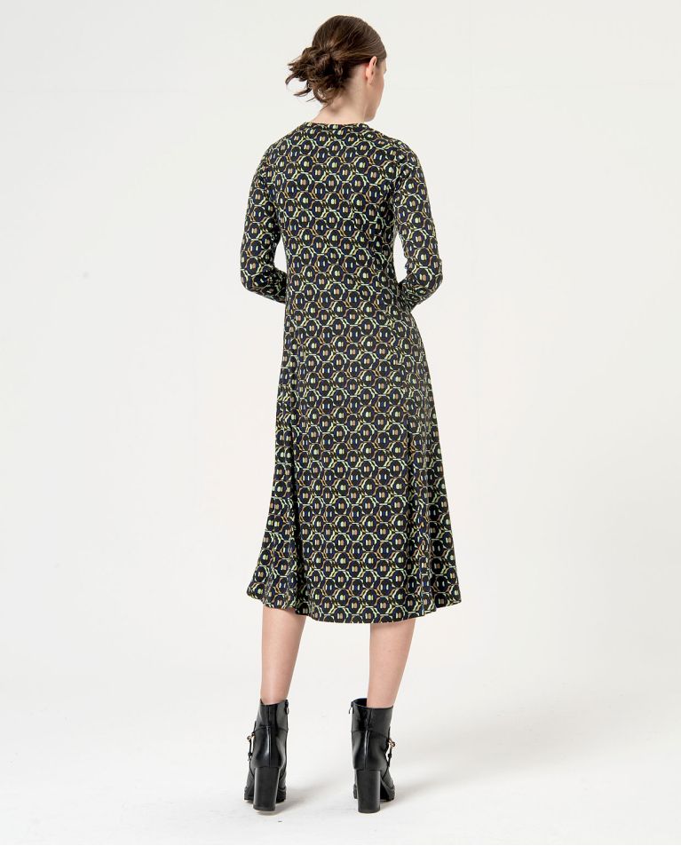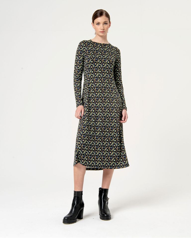 Vestido midi de manga larga y escote redondo. Tejido fluido y elástico. Ligeramente entallado en la cintura.