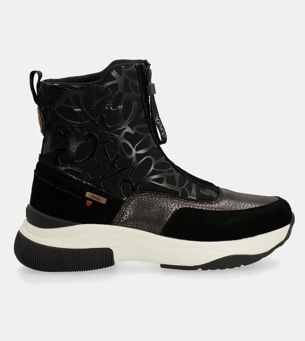 Su original diseño combina una base negra con toques estampados y efecto metalizado irisado, con suela bicolor en blanco y negro. Se abre mediante cremallera en la parte frontal y cuentan con una cómoda y amplia suela, que garantizará la comodidad de cada paso, gracias al amortiguador que incorpora en el talón.