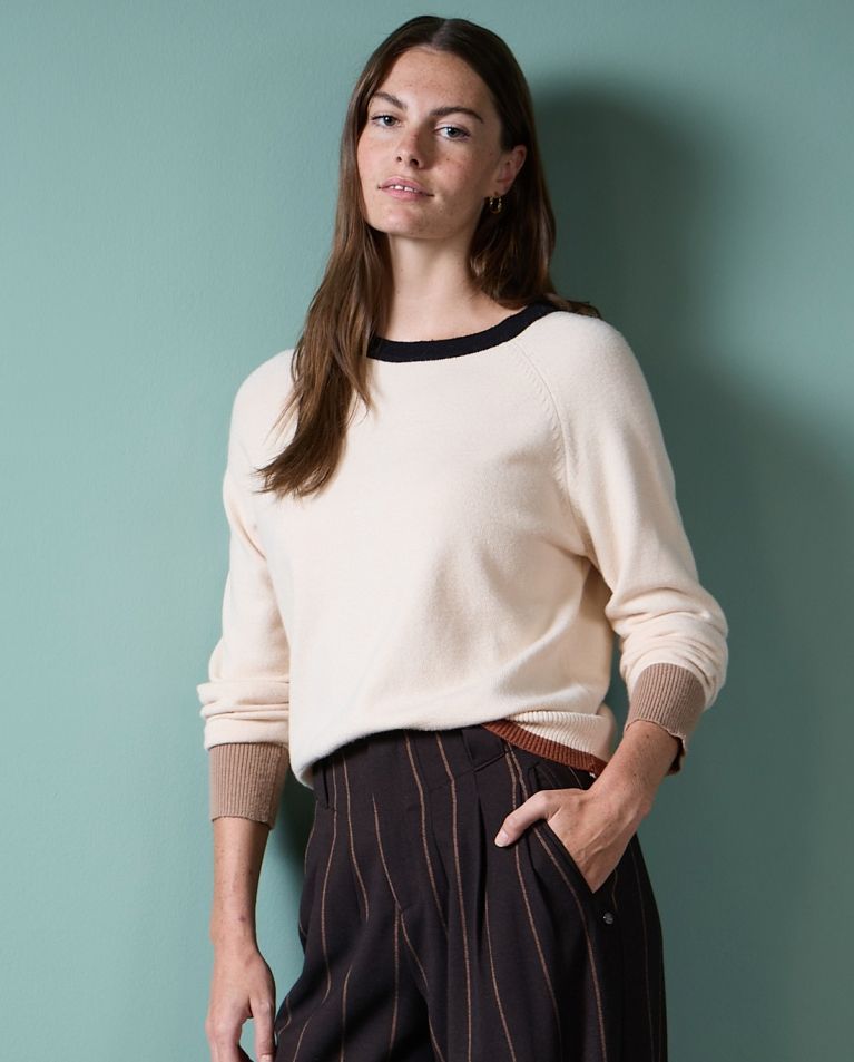Jersey de punto con cuello redondo y detalles bicolor en cuello, puños y bajo. De corte recto y manga larga, es una prenda versátil y ligera, ideal para el día a día con un toque distintivo.