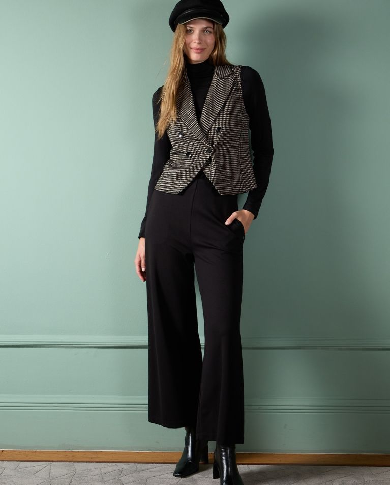 Pantalón flare ligeramente acampanado, sin cierres y con dos botones decorativos a los lados de la cintura. Su largo tobillero y su tejido elástico ofrecen comodidad y un toque moderno para combinar con blazer o tops estampados.