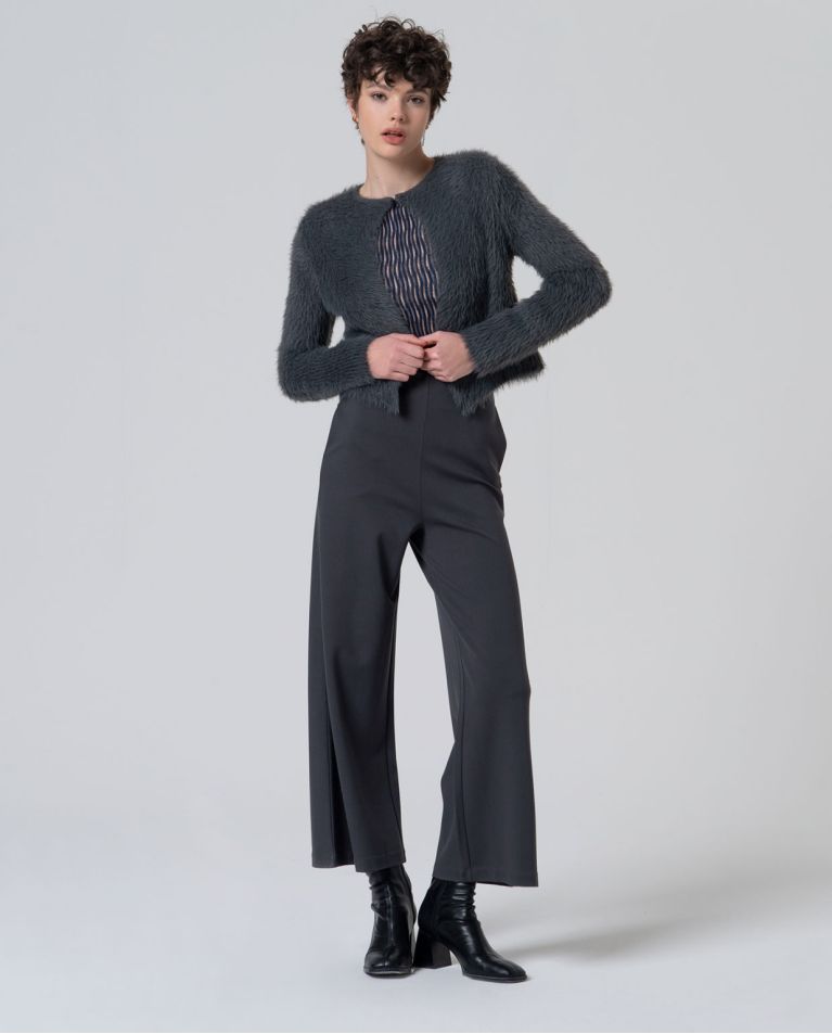 Pantalón flare ligeramente acampanado, sin cierres y con dos botones decorativos a los lados de la cintura. Su largo tobillero y su tejido elástico ofrecen comodidad y un toque moderno para combinar con blazer o tops estampados.