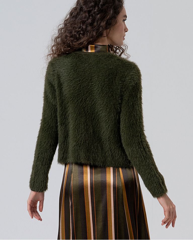 Chaqueta corta de efecto pelo, con cierre de gancho en el escote. De tacto muy suave, es una prenda ligera y envolvente que aporta un toque sofisticado al look sin perder comodidad. Ideal para combinar con pantalones de tiro alto o vestidos entallados.