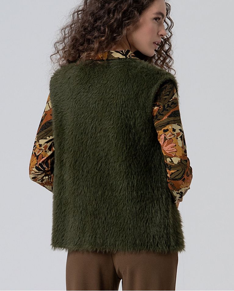Chaleco sin cierre con acabado efecto pelo, ideal para superponer sobre camisas o jerséis finos. Tejido suave y ligero con textura gustosa al tacto. Un extra de estilo para looks de entretiempo o capas otoñales.