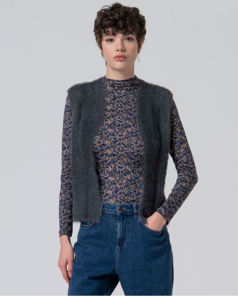 Chaleco sin cierre con acabado efecto pelo, ideal para superponer sobre camisas o jerséis finos. Tejido suave y ligero con textura gustosa al tacto. Un extra de estilo para looks de entretiempo o capas otoñales.