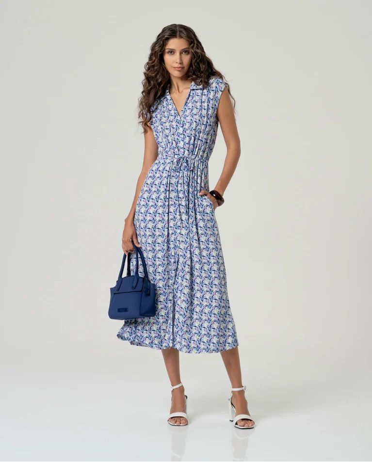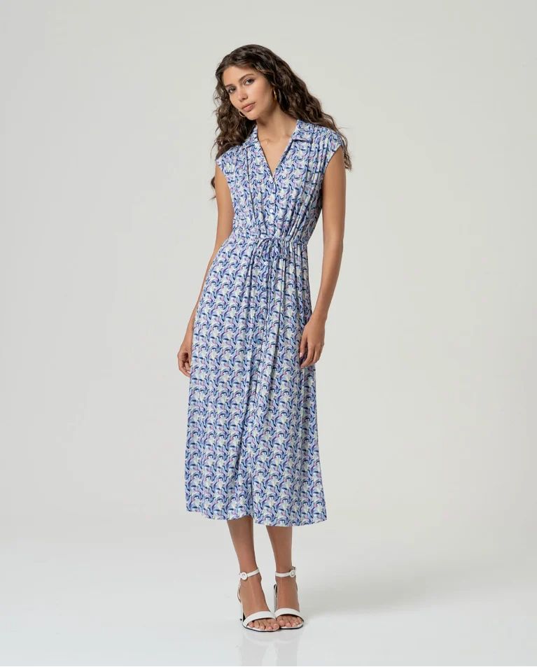 Vestido midi estampado sin mangas con cuello camisero y cierre frontal de botones. Corte recto con cinturón del mismo tejido y bolsillos laterales. Confeccionado en tejido ligero con viscosa EcoVero y elastano