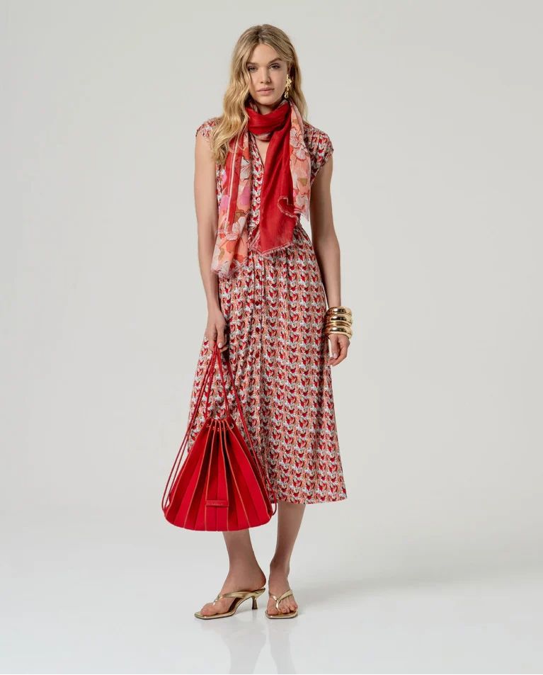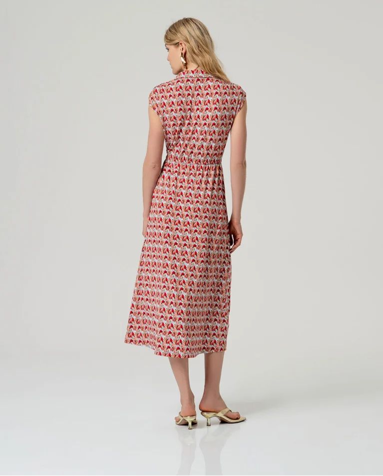 Vestido midi estampado sin mangas con cuello camisero y cierre frontal de botones. Corte recto con cinturón del mismo tejido y bolsillos laterales. Confeccionado en tejido ligero con viscosa EcoVero y elastano