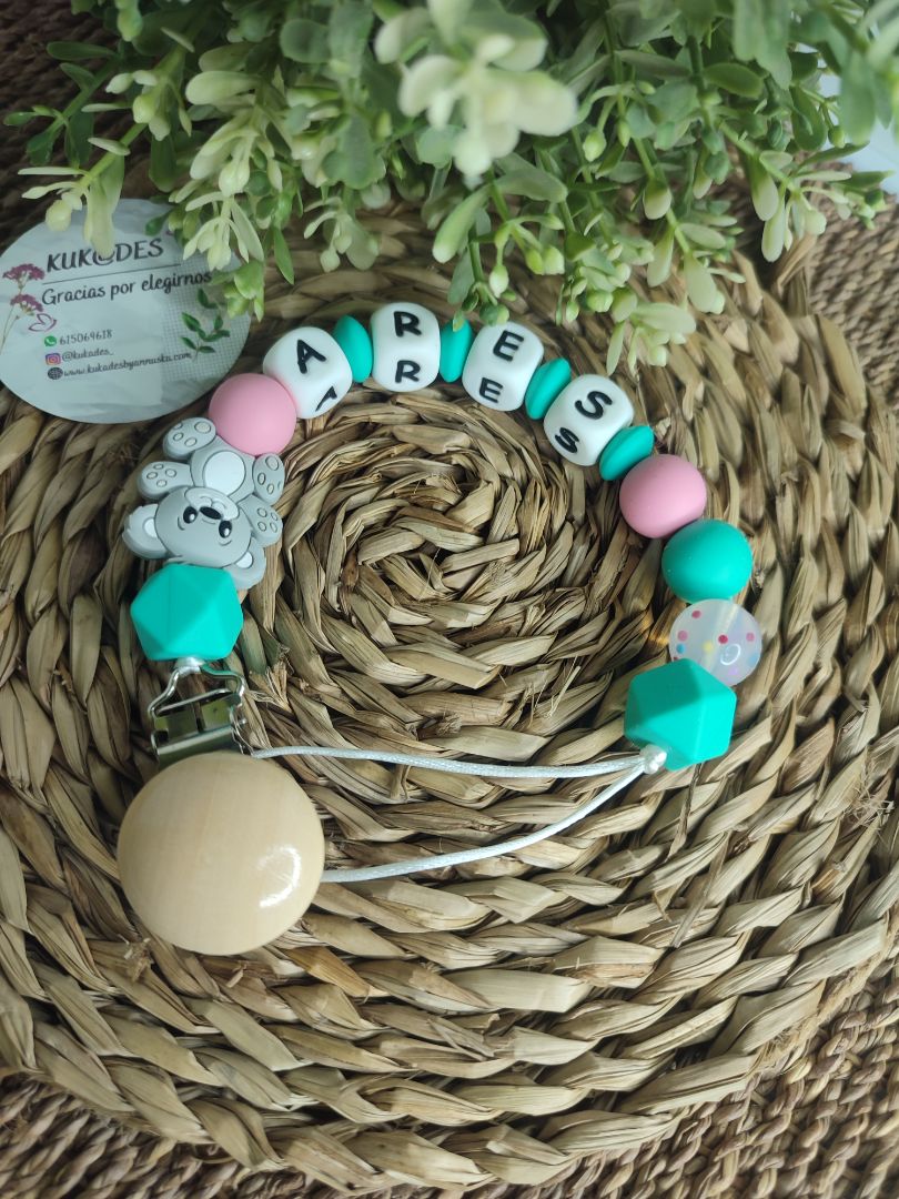 Chupetero con pinza de madera en rosa, turquesa y gris , con osito y nombre. Silicona alimentaria.