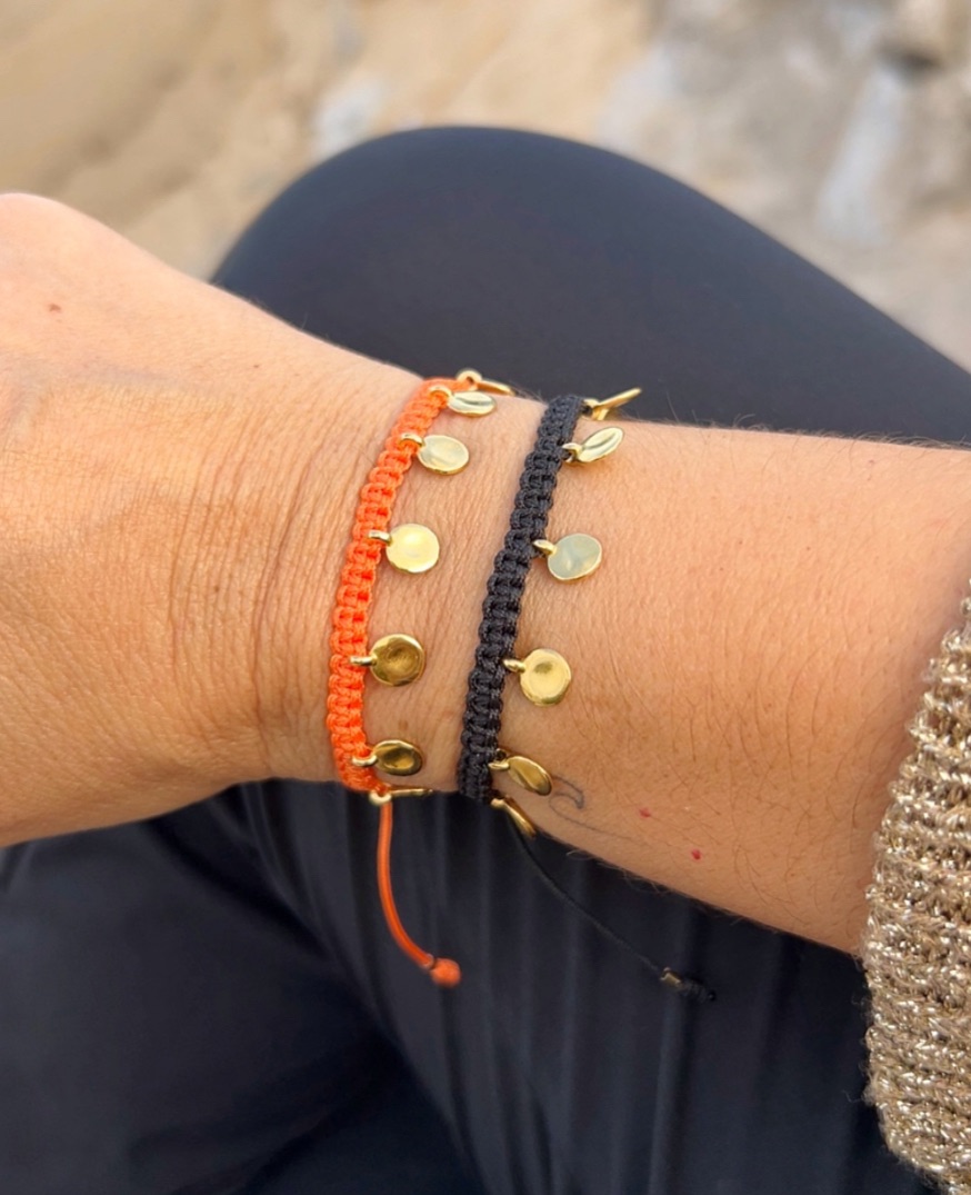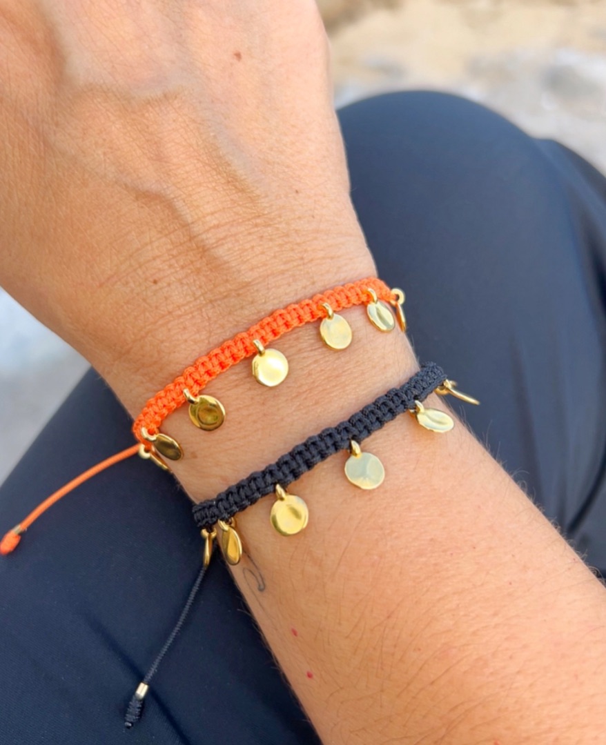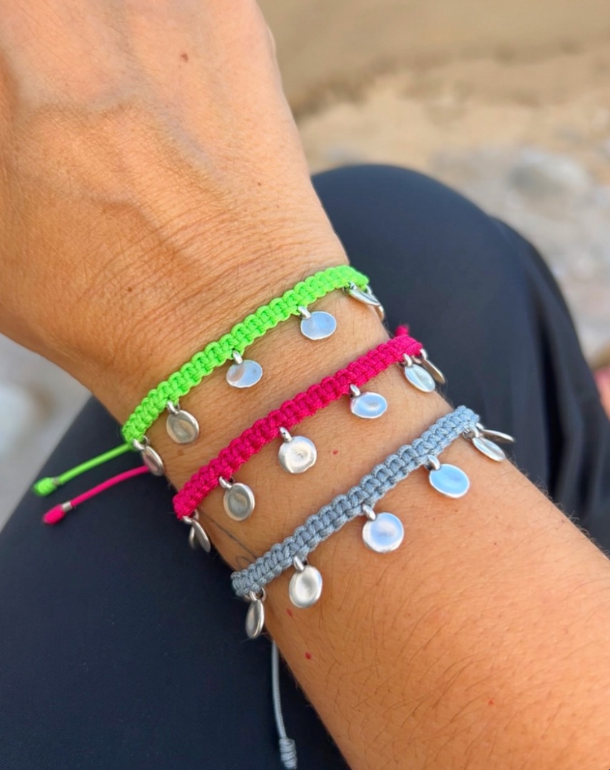 Disponible con las medallitas doradas o plateadas. Muy resistentes al agua. Pulsera disponible en infinidad de colores. Cierre nudo corredero.