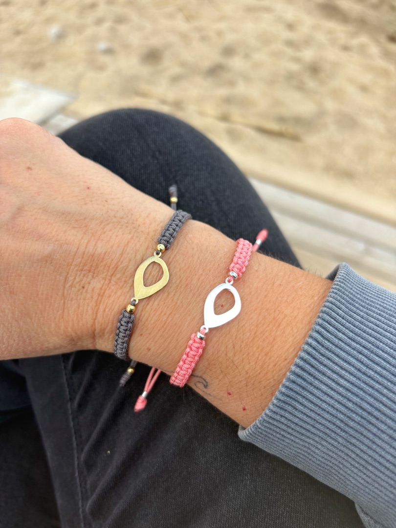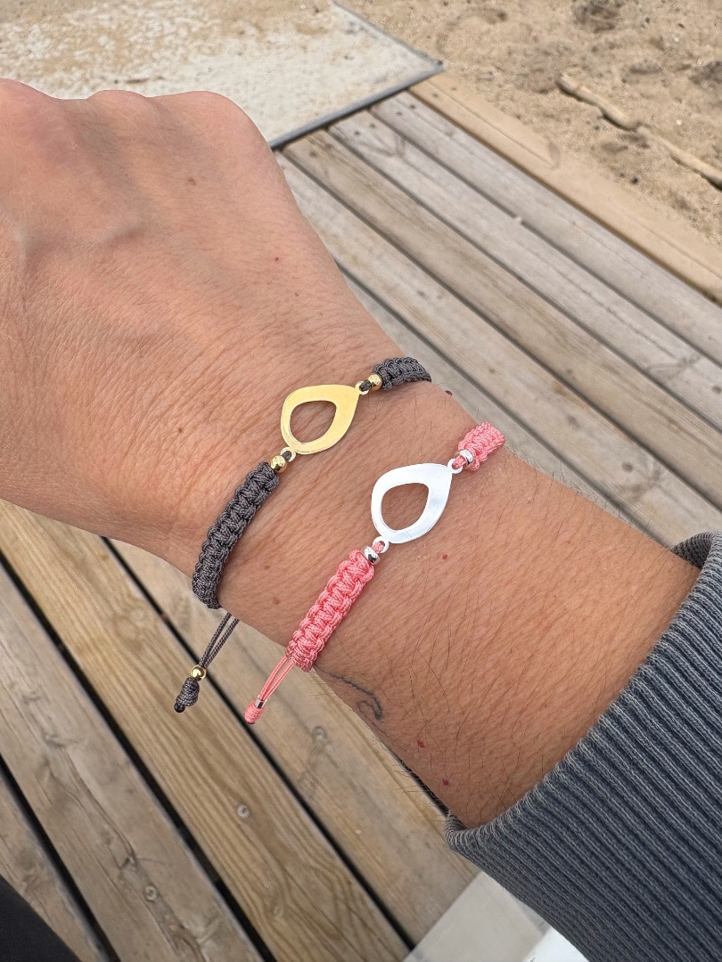 Disponible en plata de ley o bañada en oro. Bolitas y aritos a conjunto. Cierre nudo corredero. Se puede escoger el color del hilo entre gran variedad.