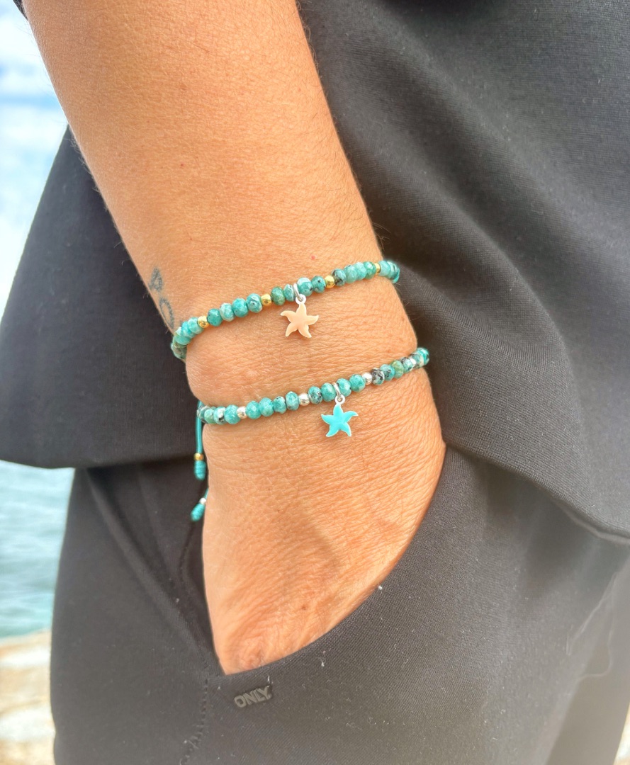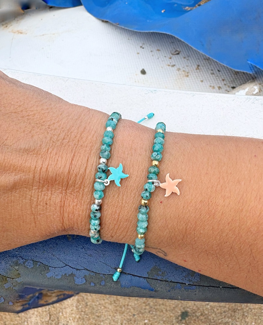 El jade verde-agua són piedras naturales resistentes al agua. Estan combinadas con bolitas en plata de ley o bañadas en oro. El colgante de estrella de mar esmaltado de color está disponible en los dos colores de la foto. Cierre nudo corredero. Resistente al agua, la que lleva las bolitas bañadas en oro con el agua irá perdiendo el baño dorado y se quedará en plata.
