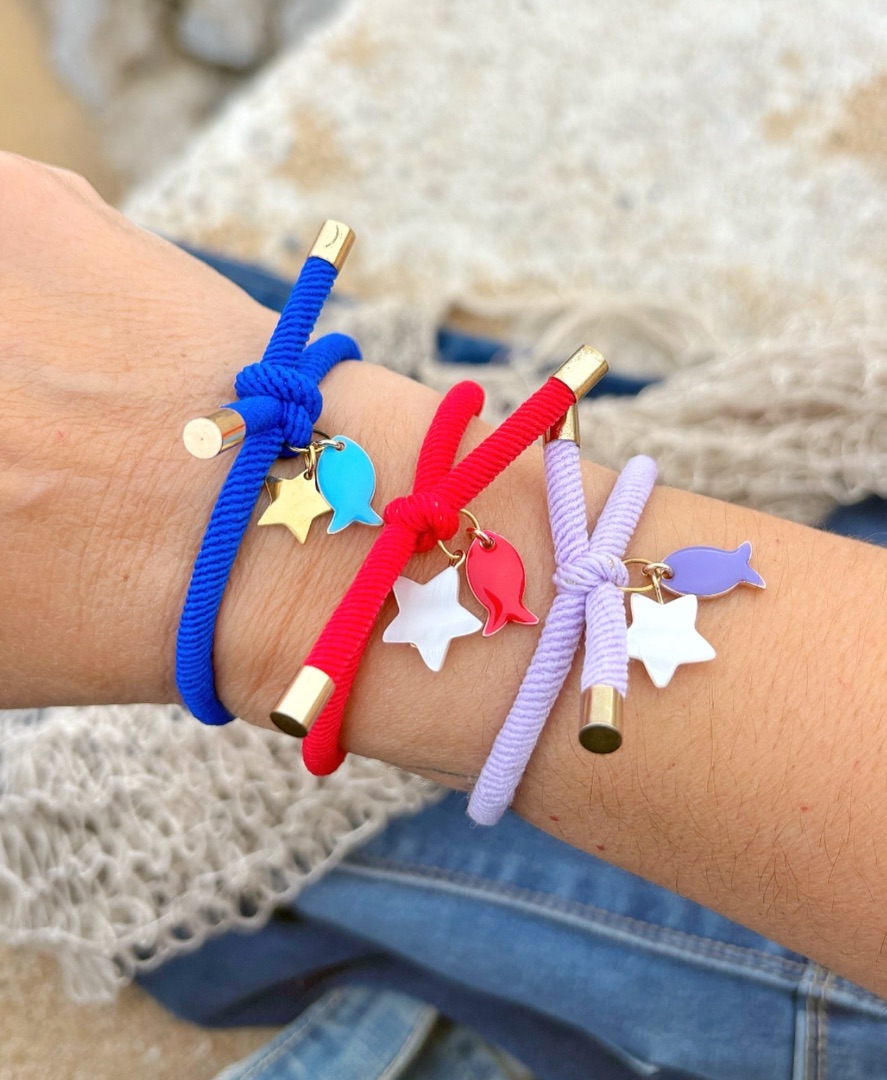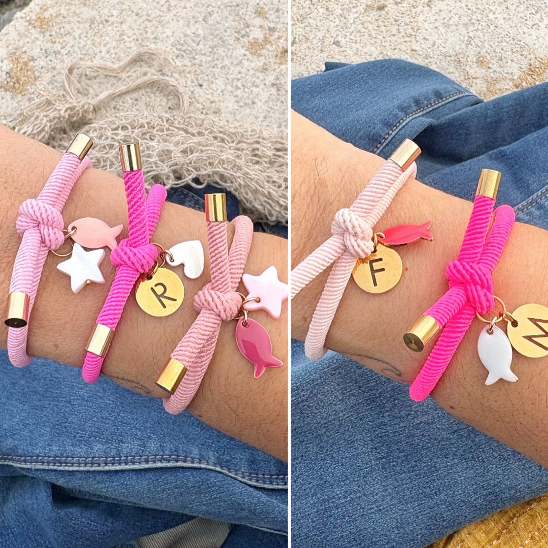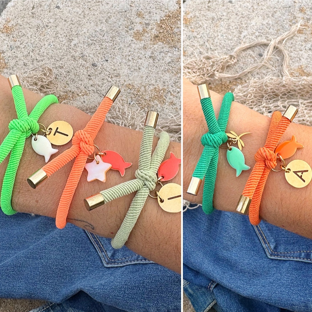 Puedes escoger el color de la pulsera y los colgantes que más te gusten. Estos són de acero y nacar. Puntas doradas a juego.