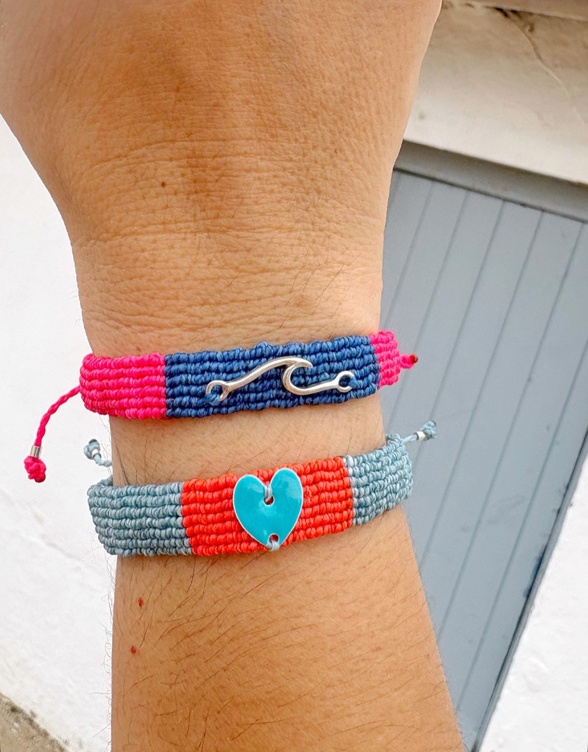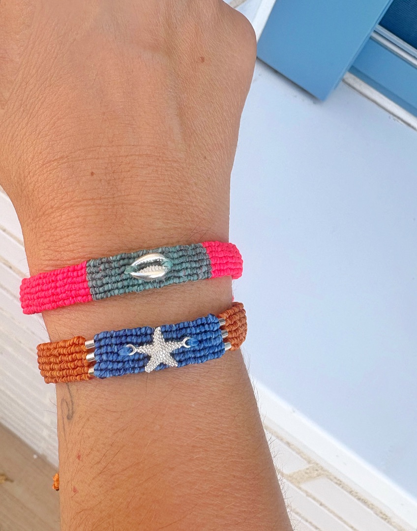 Pulsera hecha a mano nudo a nudo. Puedes escoger los colores de tu pulsera, hay infinidad🌈. Pieza central de plata de ley. Resistente al agua💦. Cierre nudo corredero. Si la quieres sin la pieza central su precio són 15€.