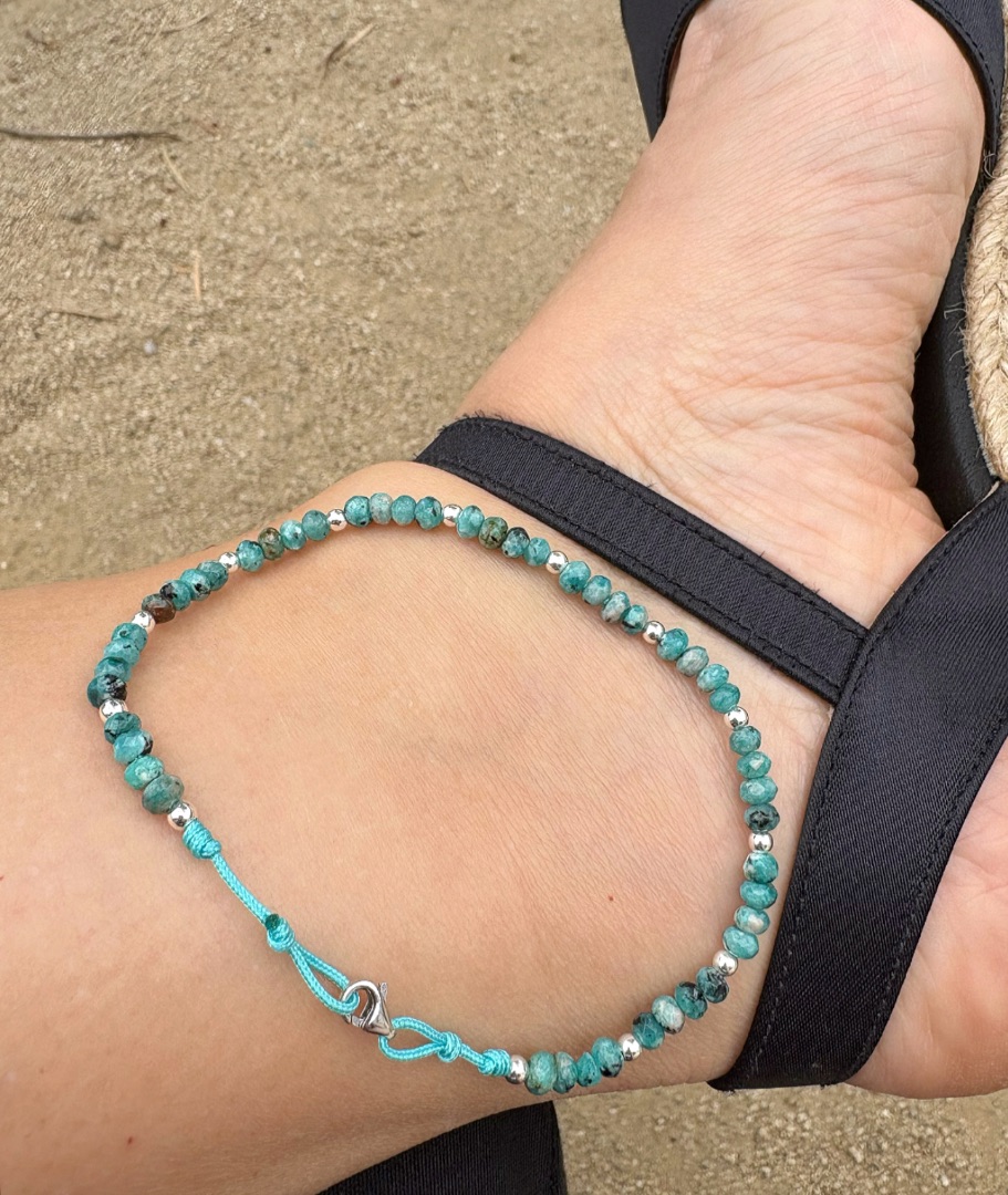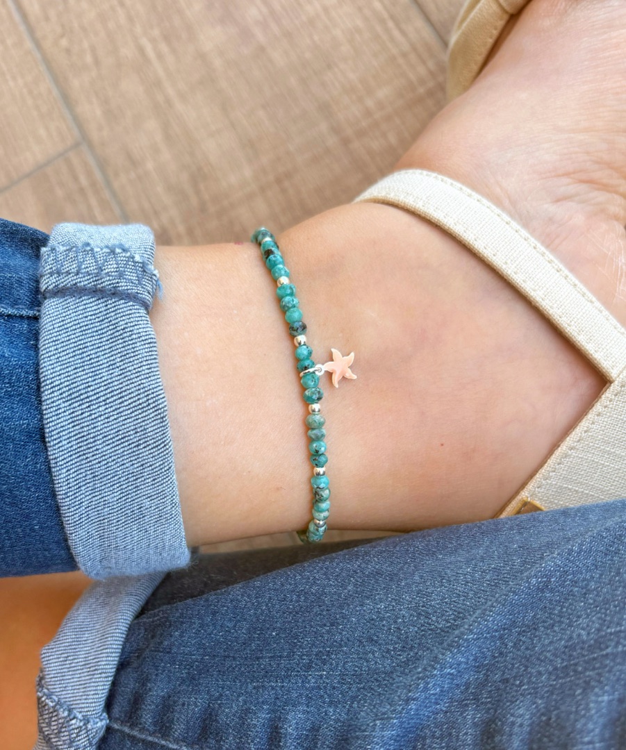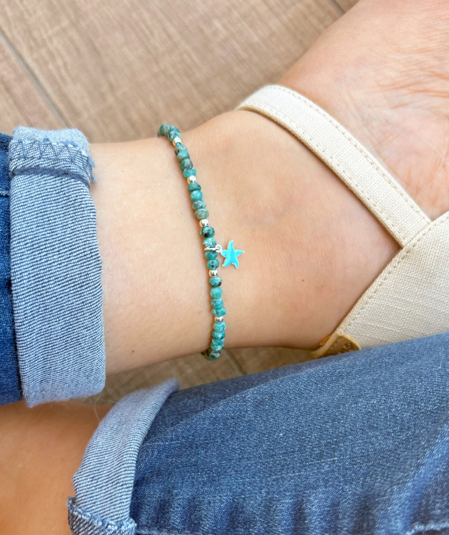 Las jade estan intercaladas con pequeñas bolitas de plata de ley. El cierre és de mosquetón también de plata y tiene dos nudos correderos para ajustar la tobillera a tu medida. Tienes la opción del colgante de la estrella de mar esmaltada de color (el precio serían 18€).Resistente al agua💦