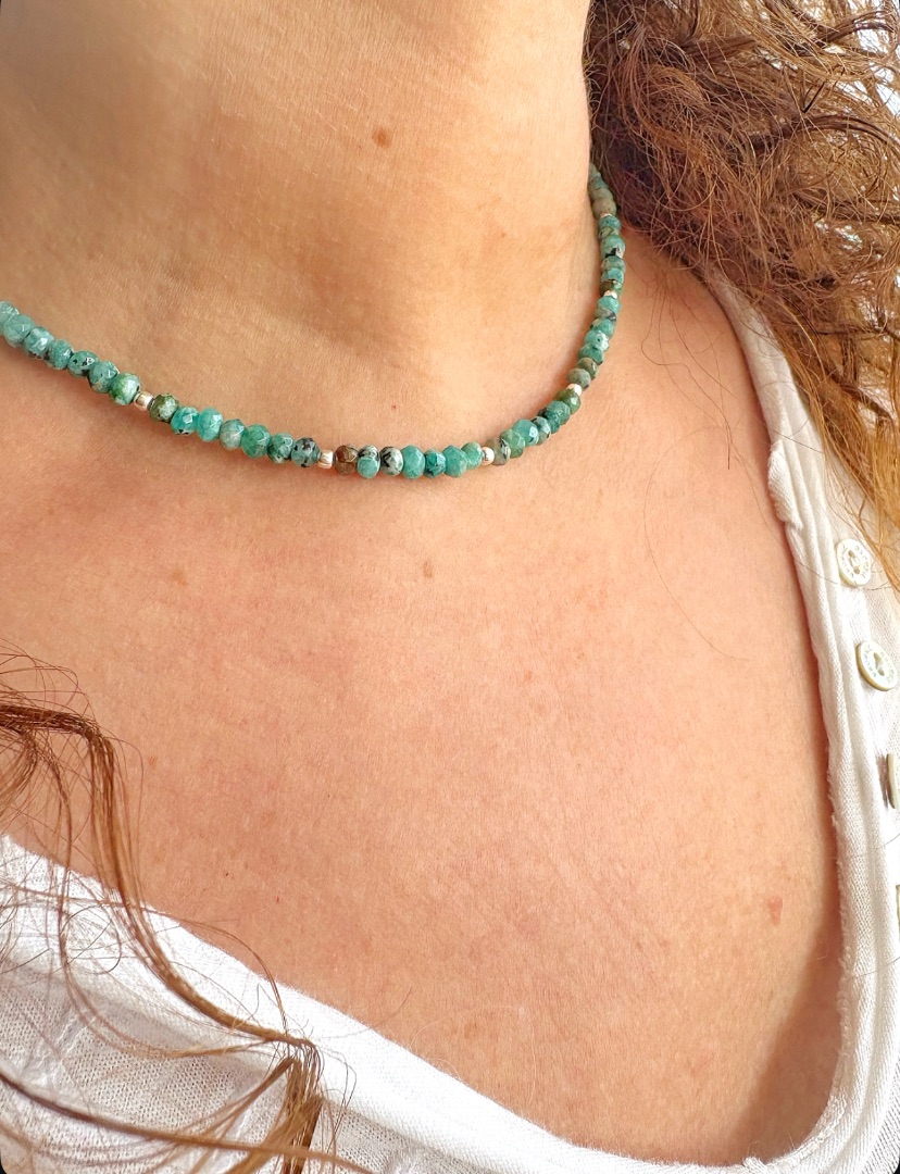 Las jade són piedras naturales con un color precioso verde-agua. Són resistentes al agua💦. Tienes a conjunto la pulsera y la tobillera. Intercala pequeñas bolitas en plata de ley o bañadas en oro. El cierre és de mosquetón también de plata y puedes regularte el collar con los nuditos que són correderos.