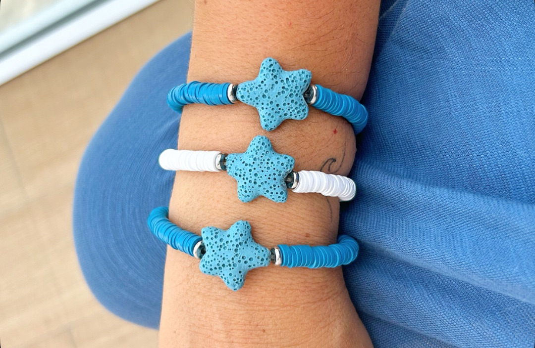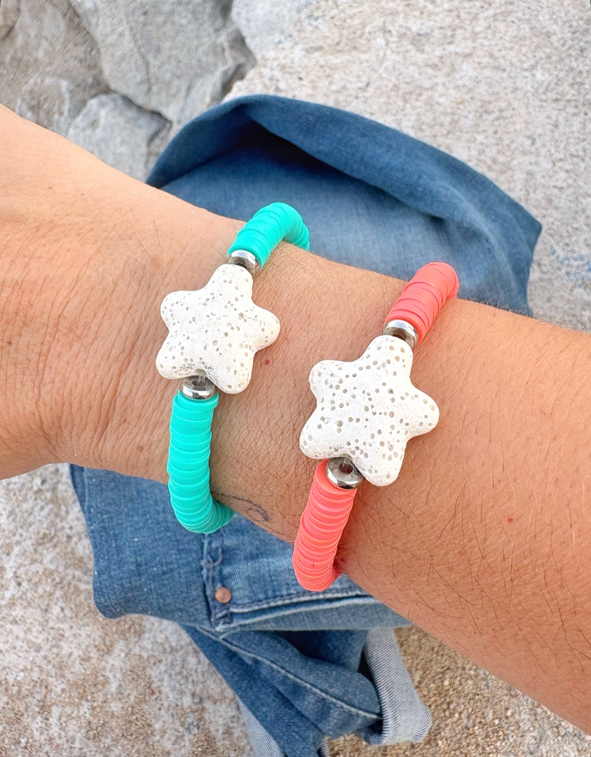 La estrella de mar és de piedra volcánica disponible en los 3 colores de las fotos. Arandelas heishi disponibles en muchos colores. Arandelas junto a la estrella plateadas o doradas de acero.