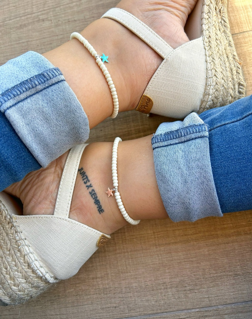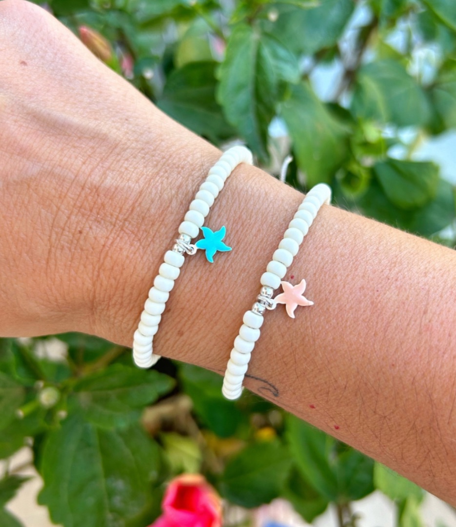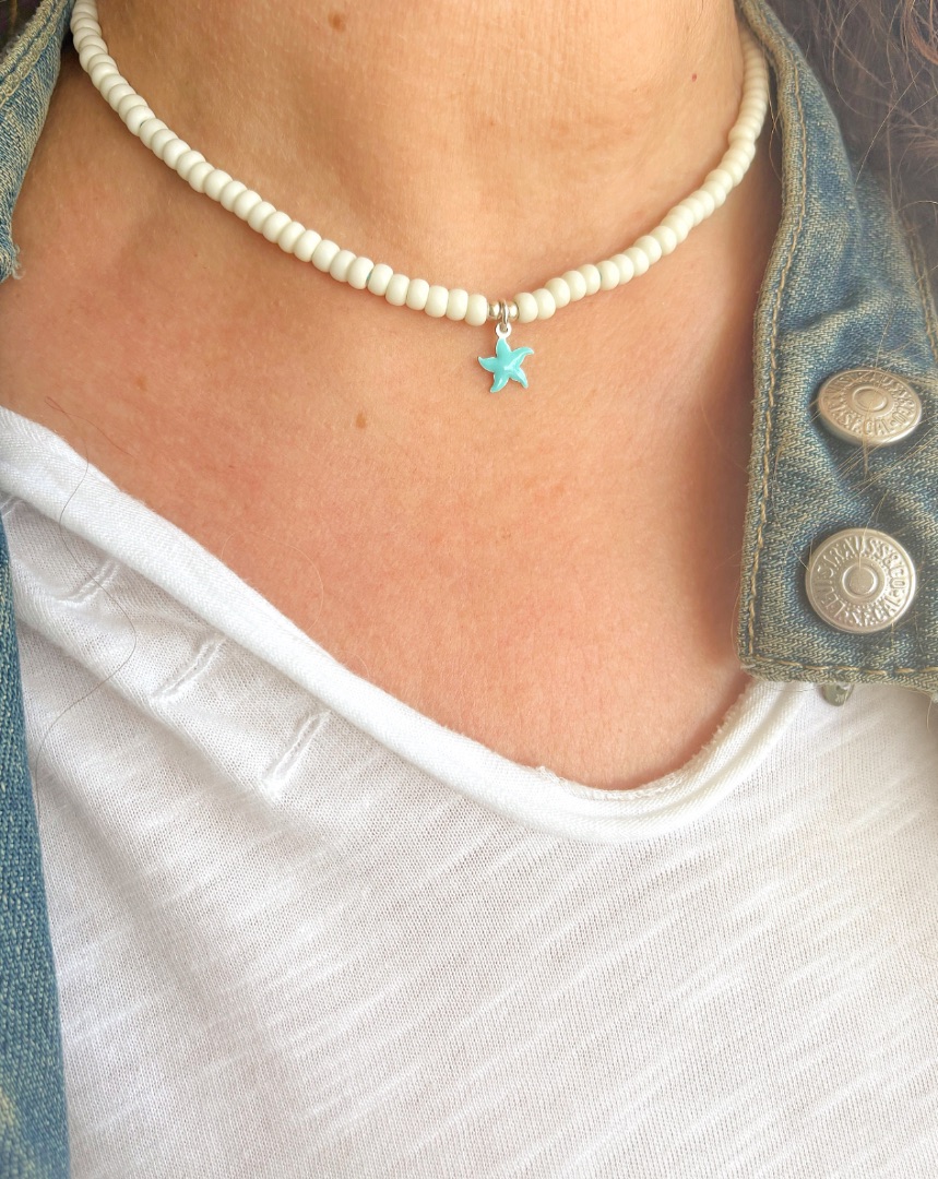 Las bolitas, cierre y estrella de mar són de plata de ley. La rocalla miyuki és de color marfil. Puedes escoger entre la estrella de mar color coral o color turquesa. Puedes ajustarte la medida del collar con los dos nuditos que són correderos.