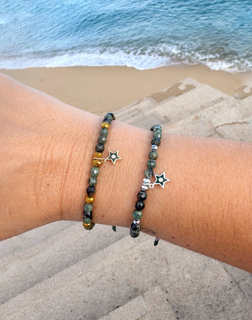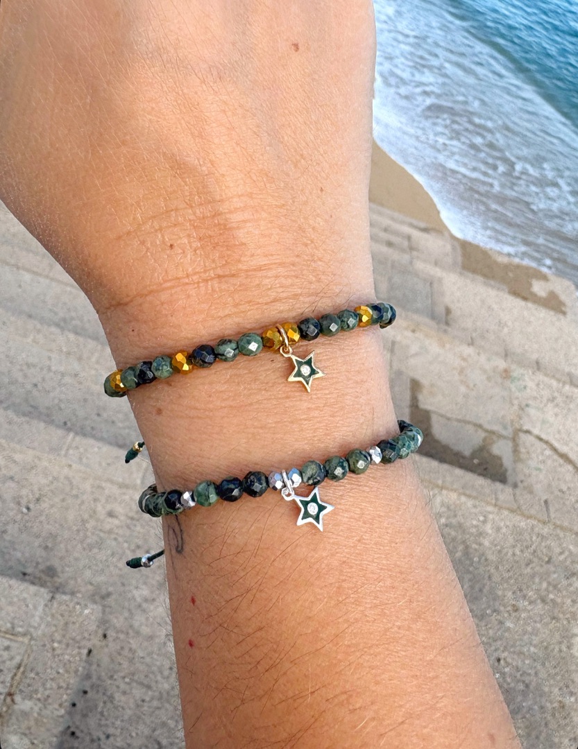 Combinada con cuentas facetadas doradas o plateadas brillantes. Colgante de estrella esmaltada en verde en plata de ley o bañada en oro con circonita. Cierre nudo corredero. Resistente al agua💦la de plata de ley, la que lleva un baño de oro mejor no mojar para su mayor durabilidad.