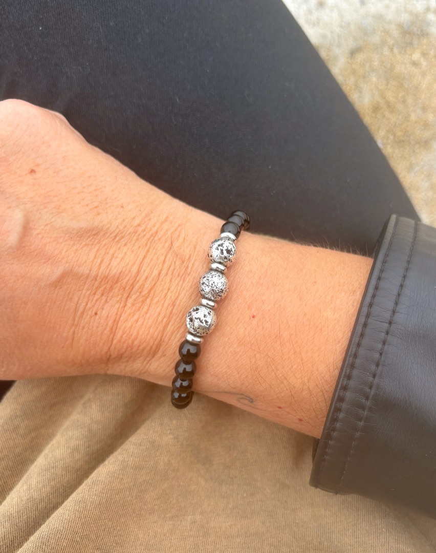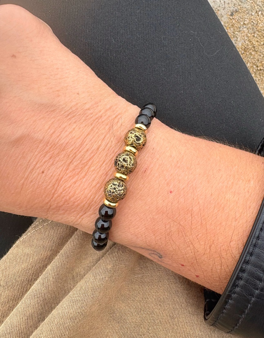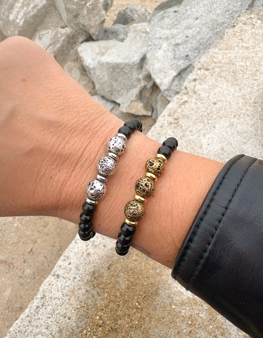 El ónix negro brillante combinado con estas de piedras de lava doradas o plateadas quedan muy elegantes y finas. Los aros són de zamak a conjunto. Dicen que el ónix es una de las piedras más antiguas y simboliza decisión y fuerza. Además que se reconoce por sus propiedades energéticas, és una piedra capaz de absorber de manera efectiva todas las energías negativas, convirtiéndolas inmediatamente en energías positivas, fomentando la vitalidad.
