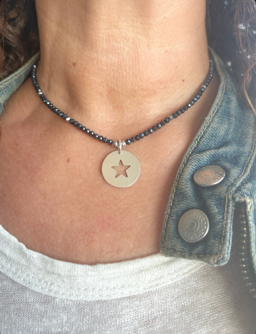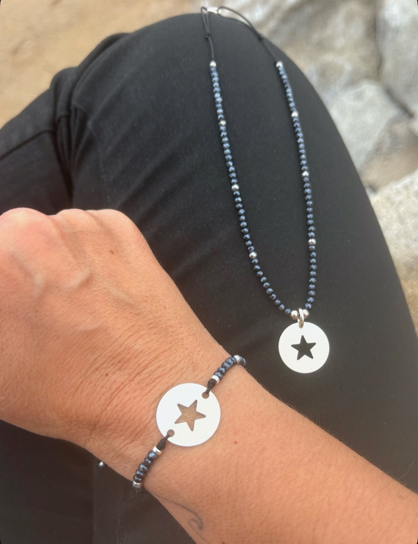 Hematites negras azuladas y brillantes combinadas con cuentas facetadas de cristal plateado. Bolitas centrales y cierre de plata de ley. La medalla redonda con estrella tiene una medida de 20mm y también és de plata de ley. Puedes ajustar la medida del collar con los dos últimos nuditos que són correderos. Resistente al 💦