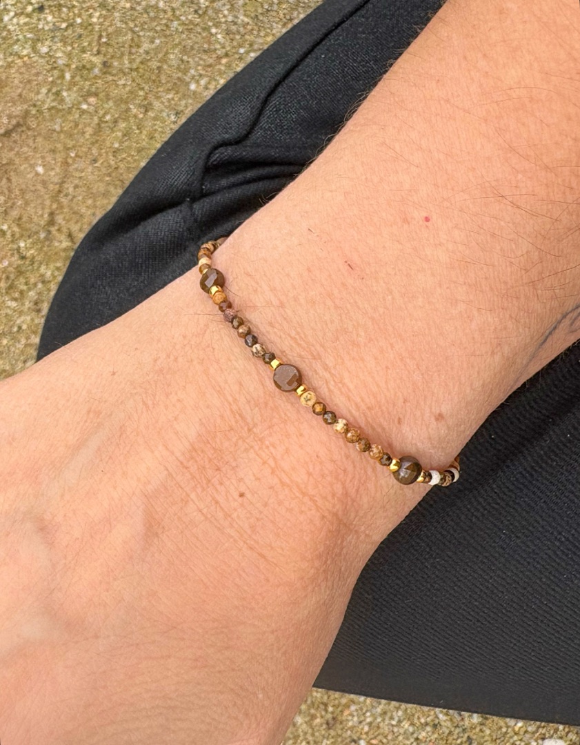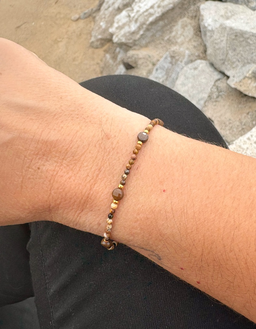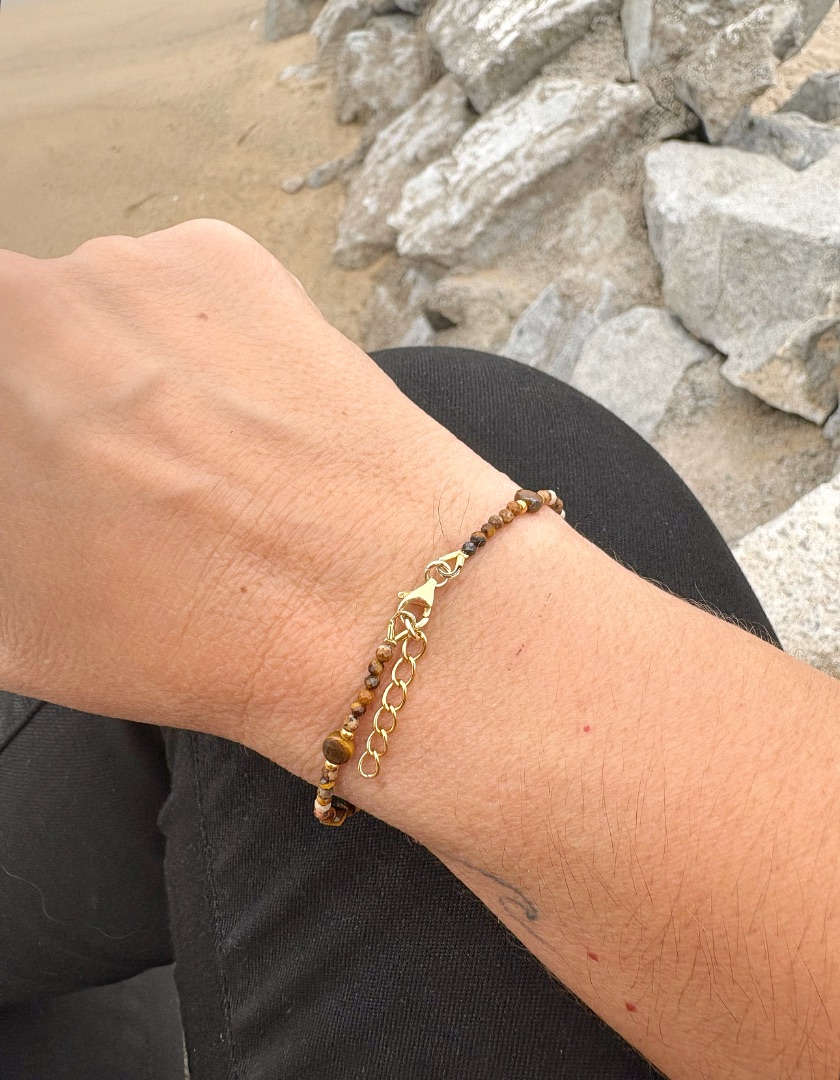 Pequeñas cuentas microfacetadas de jaspe camello de 2mm combinadas con cuentas redondas de ojo de tigre. Aritos intercalados de plata de ley bañados en oro. Cierre de mosquetón de plata con baño de oro igual que la cadenita alargadora para regularte la medida de la pulsera. Aconsejo no mojar para la mayor durabilidad del baño de oro.