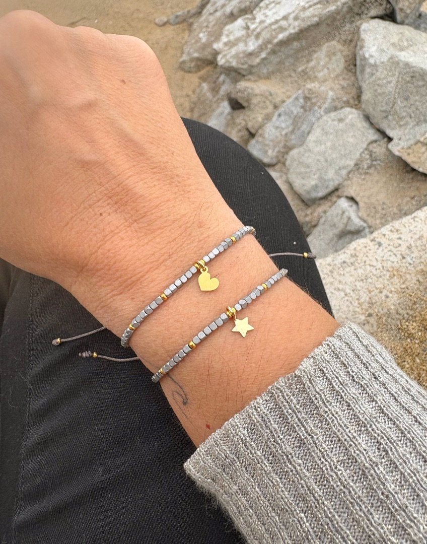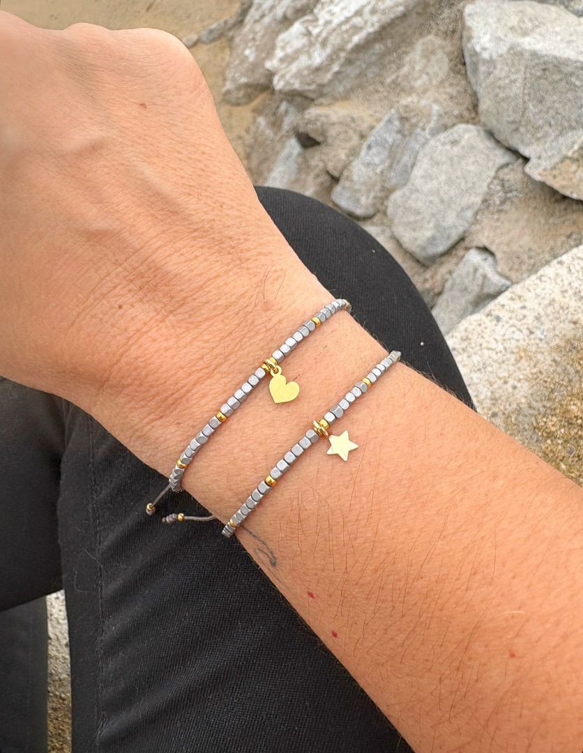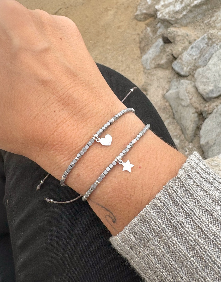 Las hematites són pequeñitas, plateadas y mates. Combinadas con pequeños aritos en plata o bañados en oro. Colgante de estrella o corazón en plata de ley o bañado en oro. Cierre nudo corredero. Resistente al💦