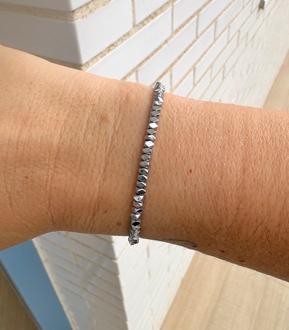 Collar corto de hematites. Cierre de mosquetón de plata de ley. Puedes ajustarte el collar a tu medida con los dos nuditos que són correderos. Resistente al agua💦