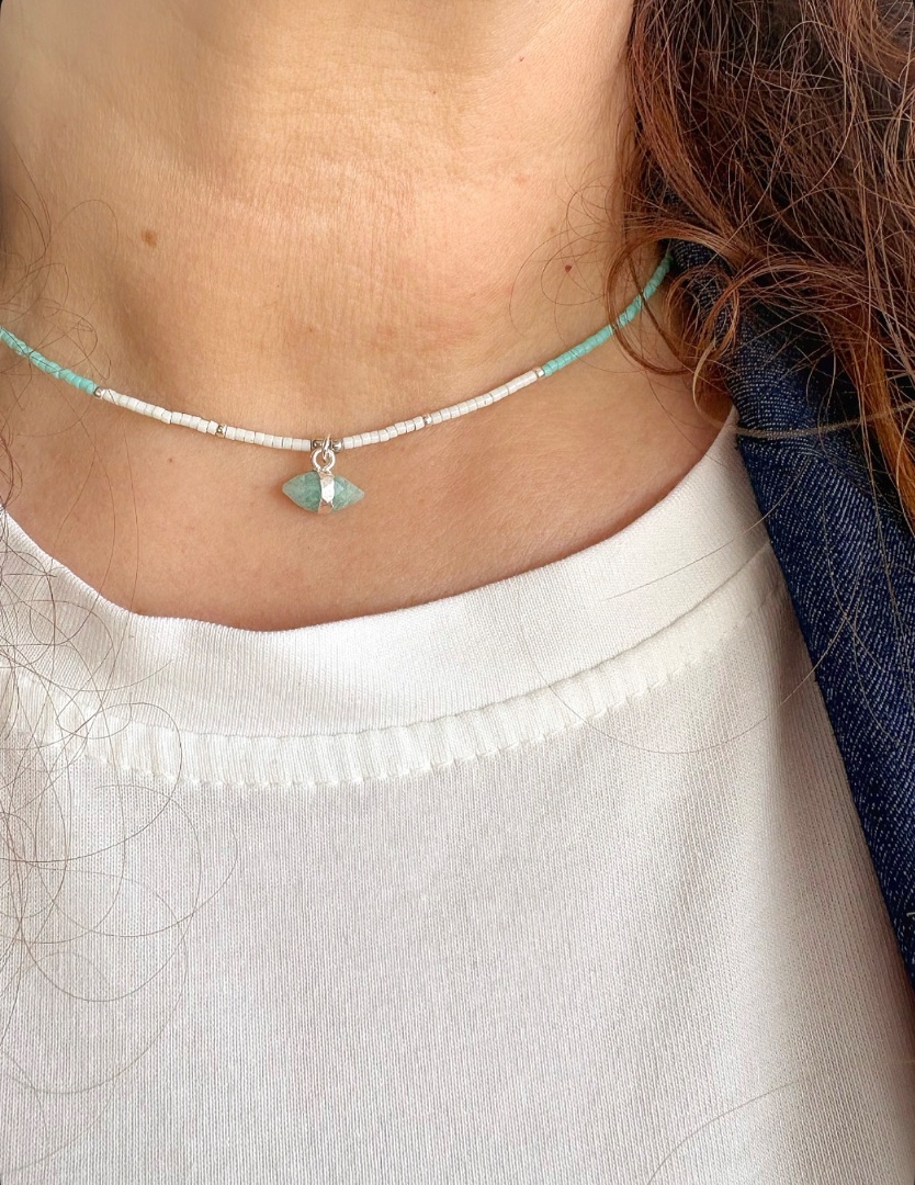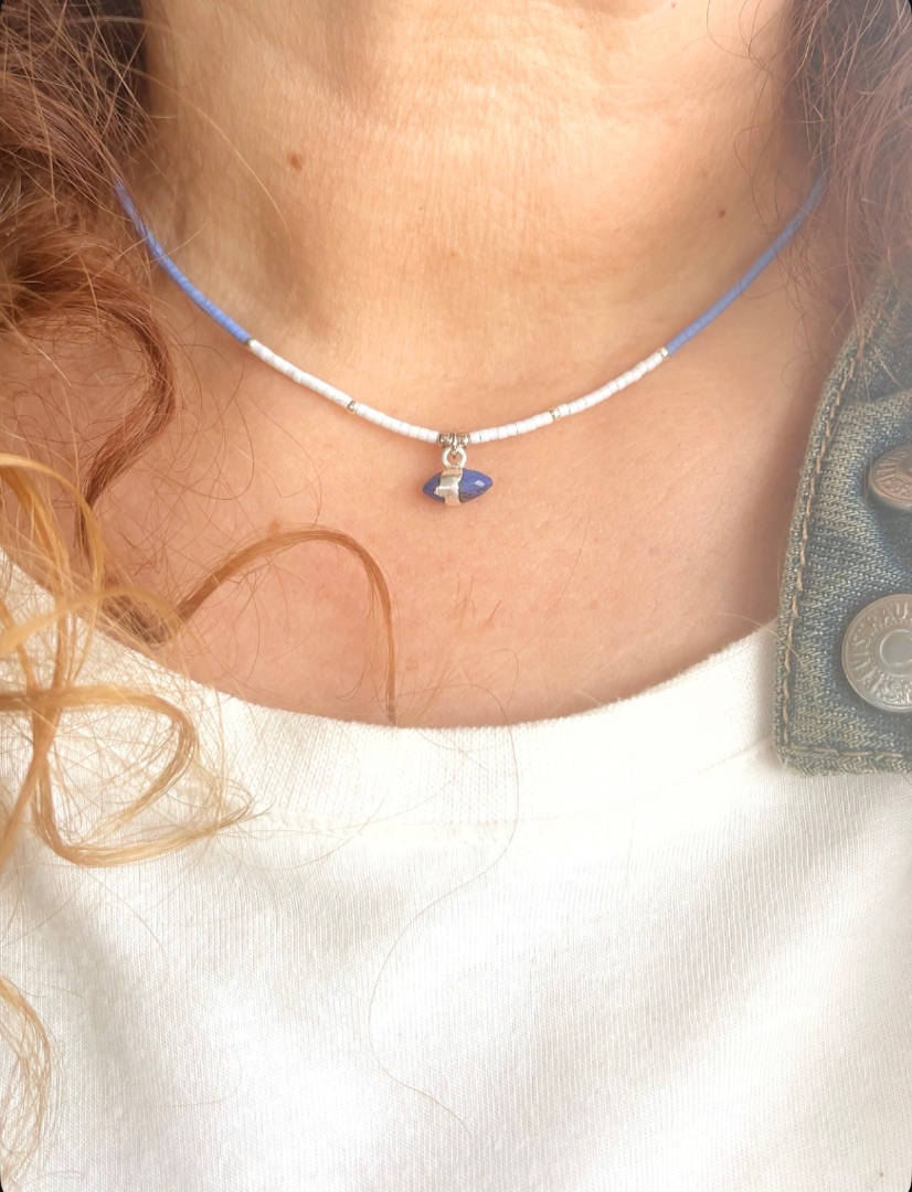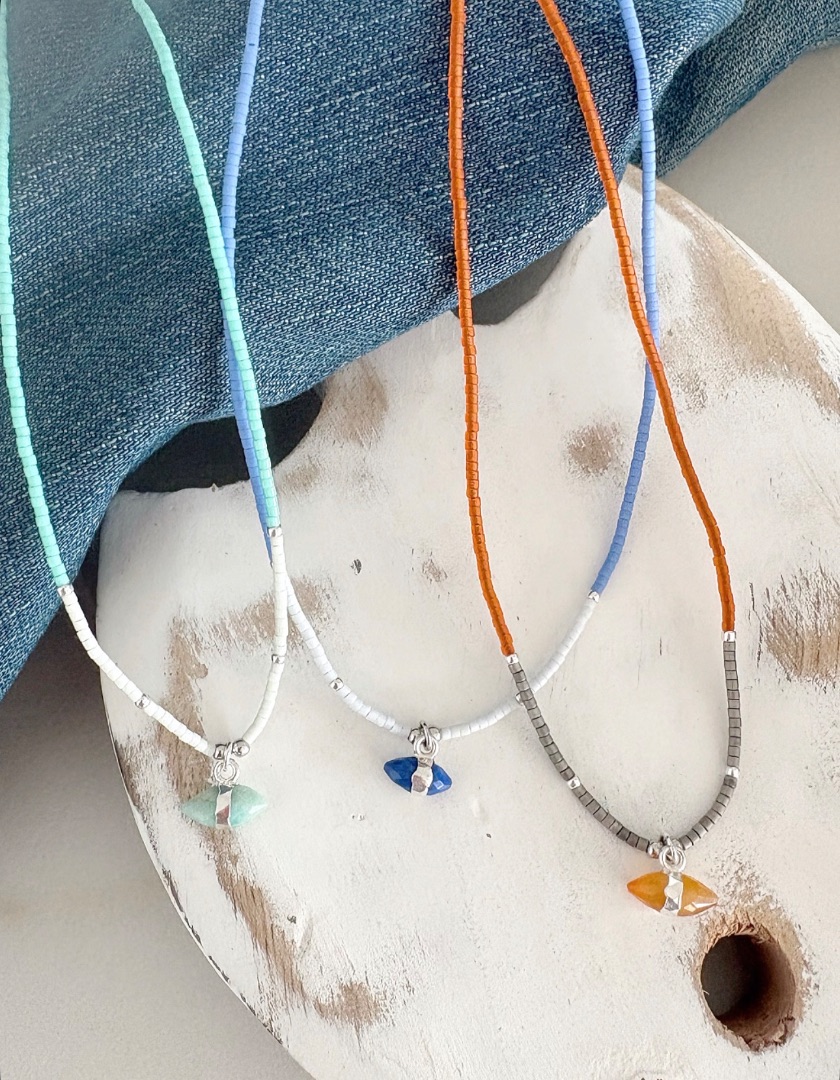 Pequeñas miyuki delica con colgante de piedra natural y plata. Disponible con los 3 colores: amazonita turquesa, lapislázuli azul y ágata naranja. El collar se puede regular con los dos nuditos que són correderos.